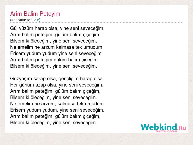 Gül yüzüm harap olsa, yine seni seveceğim. Arım balım peteğim, gülüm balım çiçeğim, Bilsem ki öleceğim, yine seni seveceğim. Ne emelim ne arzum kalmasa tek umudum Erisem yudum yudum yine seni seveceğim Arım balım petegim gülüm balım çiçeğim Bilsem ki öleceğim, yine seni seveceğim. Gözyaşım sarap olsa, gençligim harap olsa Her günüm azap olsa, yine seni seveceğim. Arım balım peteğim, gülüm balım çiçeğim, Bilsem ki öleceğim, yine seni seveceğim. Ne emelim ne arzum, kalmasa tek umudum Erisem yudum yudum, yine seni seveceğim. Arım balım peteğim, gülüm balım çiçeğim, Bilsem ki öleceğim, yine seni seveceğim.