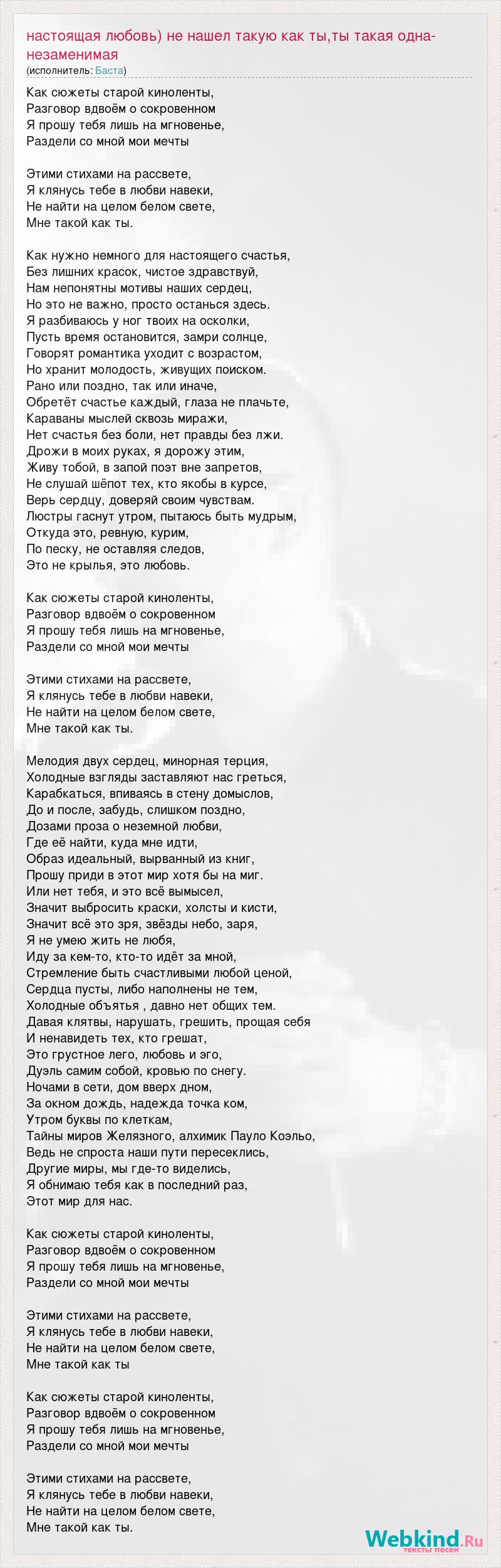 Как сюжеты старой киноленты, Разговор вдвоём о сокровенном Я прошу тебя лишь на мгновенье, Раздели со мной мои мечты Этими стихами на рассвете, Я клянусь тебе в любви навеки, Не найти на целом белом свете, Мне такой как ты. Как нужно немного для настоящего счастья, Без лишних красок, чистое здравствуй, Нам непонятны мотивы наших сердец, Но это не важно, просто останься здесь. Я разбиваюсь у ног твоих на осколки, Пусть время остановится, замри солнце, Говорят романтика уходит с возрастом, Но хранит молодость, живущих поиском. Рано или поздно, так или иначе, Обретёт счастье каждый, глаза не плачьте, Караваны мыслей сквозь миражи, Нет счастья без боли, нет правды без лжи. Дрожи в моих руках, я дорожу этим, Живу тобой, в запой поэт вне запретов, Не слушай шёпот тех, кто якобы в курсе, Верь сердцу, доверяй своим чувствам. Люстры гаснут утром, пытаюсь быть мудрым, Откуда это, ревную, курим, По песку, не оставляя следов, Это не крылья, это любовь. Как сюжеты старой киноленты, Разговор вдвоём о сокровенном Я прошу тебя лишь на мгновенье, Раздели со мной мои мечты Этими стихами на рассвете, Я клянусь тебе в любви навеки, Не найти на целом белом свете, Мне такой как ты. Мелодия двух сердец, минорная терция, Холодные взгляды заставляют нас греться, Карабкаться, впиваясь в стену домыслов, До и после, забудь, слишком поздно, Дозами проза о неземной любви, Где её найти, куда мне идти, Образ идеальный, вырванный из книг, Прошу приди в этот мир хотя бы на миг. Или нет тебя, и это всё вымысел, Значит выбросить краски, холсты и кисти, Значит всё это зря, звёзды небо, заря, Я не умею жить не любя, Иду за кем-то, кто-то идёт за мной, Стремление быть счастливыми любой ценой, Сердца пусты, либо наполнены не тем, Холодные объятья , давно нет общих тем. Давая клятвы, нарушать, грешить, прощая себя И ненавидеть тех, кто грешат, Это грустное лего, любовь и эго, Дуэль самим собой, кровью по снегу. Ночами в сети, дом вверх дном, За окном дождь, надежда точка ком, Утром буквы по клеткам, Тайны миров Желязного, алхимик Пауло Коэльо, Ведь не спроста наши пути пересеклись, Другие миры, мы где-то виделись, Я обнимаю тебя как в последний раз, Этот мир для нас. Как сюжеты старой киноленты, Разговор вдвоём о сокровенном Я прошу тебя лишь на мгновенье, Раздели со мной мои мечты Этими стихами на рассвете, Я клянусь тебе в любви навеки, Не найти на целом белом свете, Мне такой как ты Как сюжеты старой киноленты, Разговор вдвоём о сокровенном Я прошу тебя лишь на мгновенье, Раздели со мной мои мечты Этими стихами на рассвете, Я клянусь тебе в любви навеки, Не найти на целом белом свете, Мне такой как ты.