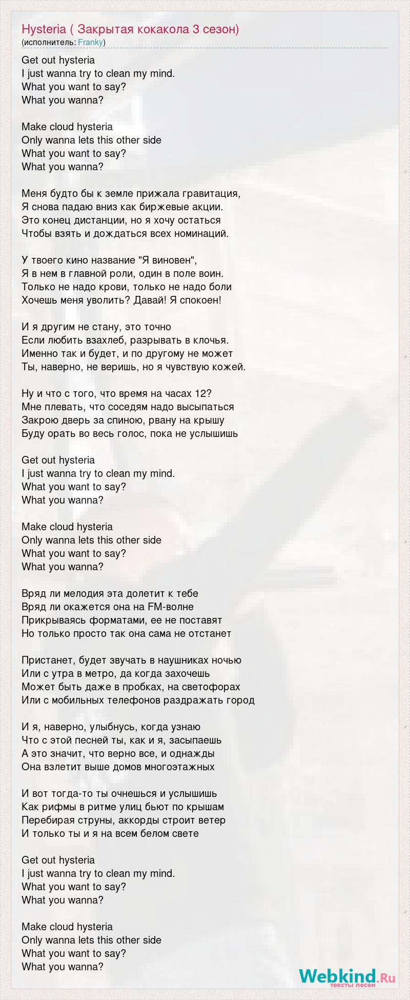Get out hysteria I just wanna try to clean my mind. What you want to say? What you wanna? Make cloud hysteria Only wanna lets this other side What you want to say? What you wanna? Меня будто бы к земле прижала гравитация, Я снова падаю вниз как биржевые акции. Это конец дистанции, но я хочу остаться Чтобы взять и дождаться всех номинаций. У твоего кино название "Я виновен", Я в нем в главной роли, один в поле воин. Только не надо крови, только не надо боли Хочешь меня уволить? Давай! Я спокоен! И я другим не стану, это точно Если любить взахлеб, разрывать в клочья. Именно так и будет, и по другому не может Ты, наверно, не веришь, но я чувствую кожей. Ну и что с того, что время на часах 12? Мне плевать, что соседям надо высыпаться Закрою дверь за спиною, рвану на крышу Буду орать во весь голос, пока не услышишь Get out hysteria I just wanna try to clean my mind. What you want to say? What you wanna? Make cloud hysteria Only wanna lets this other side What you want to say? What you wanna? Вряд ли мелодия эта долетит к тебе Вряд ли окажется она на FM-волне Прикрываясь форматами, ее не поставят Но только просто так она сама не отстанет Пристанет, будет звучать в наушниках ночью Или с утра в метро, да когда захочешь Может быть даже в пробках, на светофорах Или с мобильных телефонов раздражать город И я, наверно, улыбнусь, когда узнаю Что с этой песней ты, как и я, засыпаешь А это значит, что верно все, и однажды Она взлетит выше домов многоэтажных И вот тогда-то ты очнешься и услышишь Как рифмы в ритме улиц бьют по крышам Перебирая струны, аккорды строит ветер И только ты и я на всем белом свете Get out hysteria I just wanna try to clean my mind. What you want to say? What you wanna? Make cloud hysteria Only wanna lets this other side What you want to say? What you wanna?