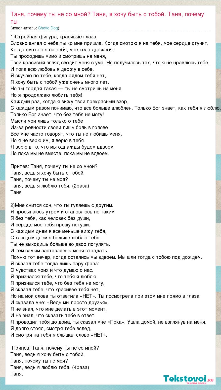 1)Стройная фигура, красивые глаза, Словно ангел с неба ты ко мне пришла. Когда смотрю я на тебя, мое сердце стучит. Когда смотрю я на тебя, мое тело дрожжит! Ты проходишь мимо и смотришь на меня, Твой красивый вгляд сводит меня с ума. Но получилось так, что я не нравлюсь тебе, И пока всю любовь я держу в себе. Я скучаю по тебе, когда рядом тебя нет, Я хочу быть с тобой уже очень много лет. Но ты гордая такая — ты не смотришь на меня. Но я продолжаю любить тебя! Каждый раз, когда я вижу твой прекрасный взор, С каждым разом понимаю, что все больше влюблен. Только Бог знает, как тебя я люблю, Только Бог знает, что без тебя не могу! Мысли мои лишь только о тебе Из-за ревности своей лишь боль в голове Все мне часто говорят, что ты не любишь меня, Но я не верю им, я верю в тебя. Я верю в то, что мы однажды будем вдвоем, Но пока мы не вместе, пока мы не вдвоем. Припев: Таня, почему ты не со мной? Таня, ведь я хочу быть с тобой. Таня, почему ты не моя? Таня, ведь я люблю тебя. (2раза) Таня 2)Мне снится сон, что ты гуляешь с другим. Я просыпаюсь утром и становлюсь не таким. Я без тебя, как человек без души, И сердце мое тебя прошу потуши. С каждым днем я все меньше вижу тебя, С каждым днем я больше люблю тебя. Ты не выходишь больше во двор погулять. И тем самым заставляешь меня страдать. Помню тот вечер, когда остались мы вдвоем. Мы шли тогда с тобою под дождем. Я сказал тебе тогда лишь пару фраз: О чувствах моих и что думаю о нас. Я признался тебе, что тебя я люблю, Я признался тебе, что без тебя не могу, Я сказал тебе, что красивее тебя нет, Но на мои слова ты ответила «НЕТ». Ты посмотрела при этом мне прямо в глаза И сказала мне: «Ведь мы просто друзья». Я не знал, что мне делать в этот момент, И не знал, что сказать тебе в ответ. Я проводил тебя до дома, ты сказал мне «Пока». Ушла домой, не взглянув на меня. Я долго стоял, смотря тебе вслед, И смотря на тебя я слышал слово «НЕТ». Припев: Таня, почему ты не со мной? Таня, ведь я хочу быть с тобой. Таня, почему ты не моя? Таня, ведь я люблю тебя. (4раза) Таня.