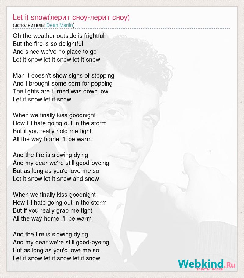 Oh the weather outside is frightful But the fire is so delightful And since we've no place to go Let it snow let it snow let it snow Man it doesn't show signs of stopping And I brought some corn for popping The lights are turned was down low Let it snow let it snow When we finally kiss goodnight How I'll hate going out in the storm But if you really hold me tight All the way home I'll be warm And the fire is slowing dying And my dear we're still good-byeing But as long as you'd love me so Let it snow let it snow and snow When we finally kiss goodnight How I'll hate going out in the storm But if you really grab me tight All the way home I'll be warm And the fire is slowing dying And my dear we're still good-byeing But as long as you'd love me so Let it snow let it snow let it snow