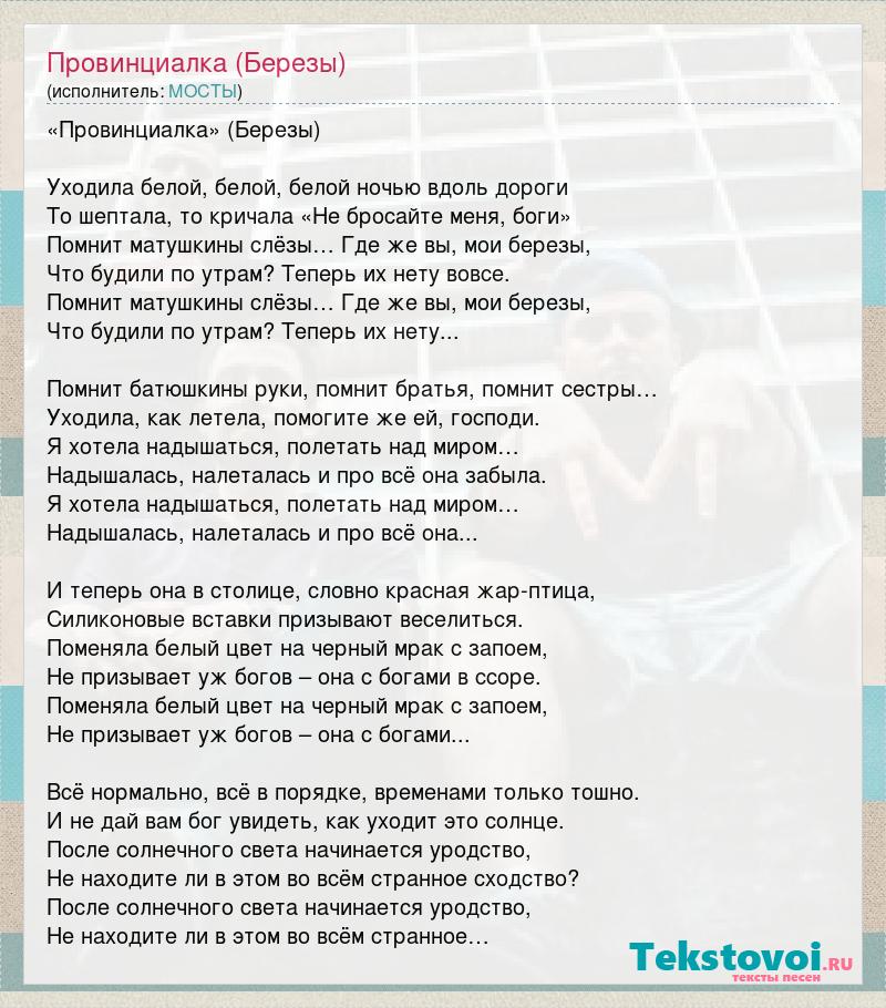 «Провинциалка» (Березы) Уходила белой, белой, белой ночью вдоль дороги То шептала, то кричала «Не бросайте меня, боги» Помнит матушкины слёзы… Где же вы, мои березы, Что будили по утрам? Теперь их нету вовсе. Помнит матушкины слёзы… Где же вы, мои березы, Что будили по утрам? Теперь их нету... Помнит батюшкины руки, помнит братья, помнит сестры… Уходила, как летела, помогите же ей, господи. Я хотела надышаться, полетать над миром… Надышалась, налеталась и про всё она забыла. Я хотела надышаться, полетать над миром… Надышалась, налеталась и про всё она... И теперь она в столице, словно красная жар-птица, Силиконовые вставки призывают веселиться. Поменяла белый цвет на черный мрак с запоем, Не призывает уж богов – она с богами в ссоре. Поменяла белый цвет на черный мрак с запоем, Не призывает уж богов – она с богами... Всё нормально, всё в порядке, временами только тошно. И не дай вам бог увидеть, как уходит это солнце. После солнечного света начинается уродство, Не находите ли в этом во всём странное сходство? После солнечного света начинается уродство, Не находите ли в этом во всём странное…