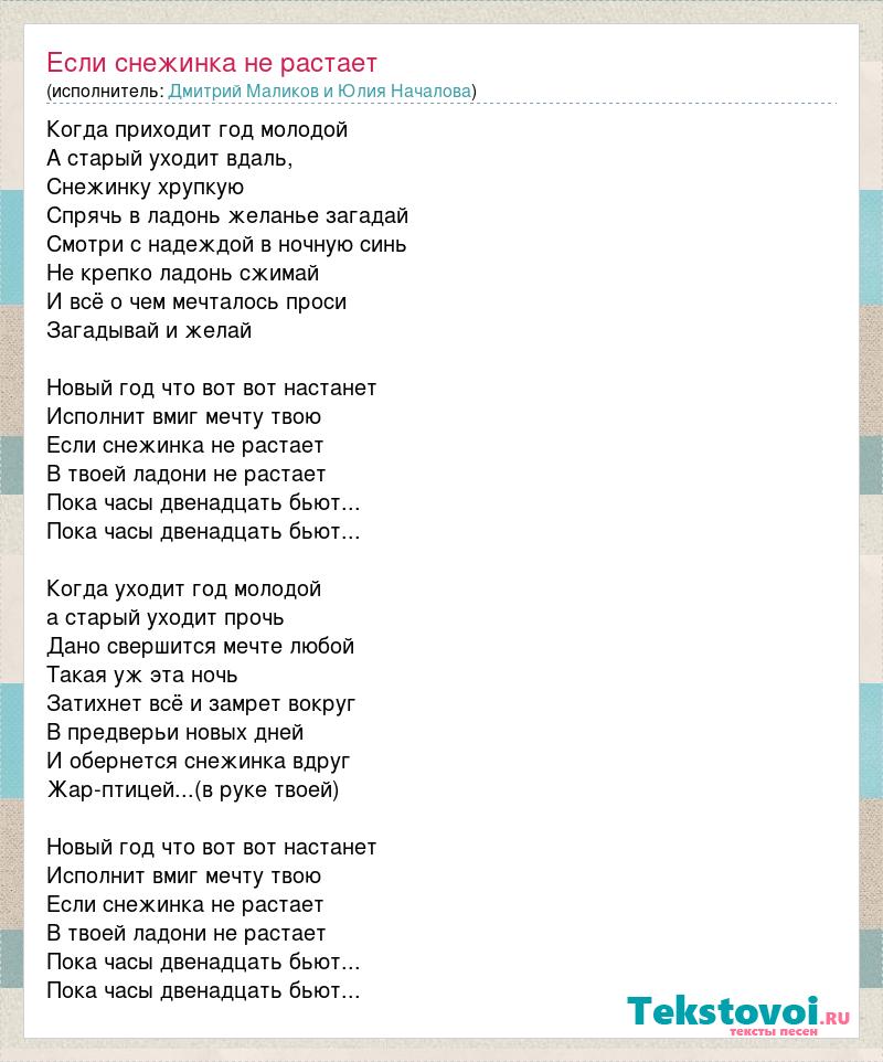 Когда приходит год молодой А старый уходит вдаль, Снежинку хрупкую Спрячь в ладонь желанье загадай Смотри с надеждой в ночную синь Не крепко ладонь сжимай И всё о чем мечталось проси Загадывай и желай Новый год что вот вот настанет Исполнит вмиг мечту твою Если снежинка не растает В твоей ладони не растает Пока часы двенадцать бьют... Пока часы двенадцать бьют... Когда уходит год молодой а старый уходит прочь Дано свершится мечте любой Такая уж эта ночь Затихнет всё и замрет вокруг В предверьи новых дней И обернется снежинка вдруг Жар-птицей...(в руке твоей) Новый год что вот вот настанет Исполнит вмиг мечту твою Если снежинка не растает В твоей ладони не растает Пока часы двенадцать бьют... Пока часы двенадцать бьют...