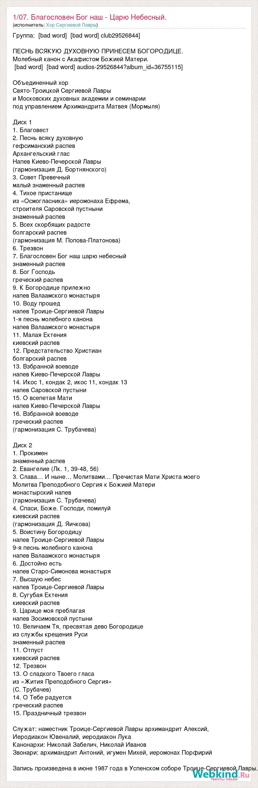 Группа: [bad word] [bad word] club29526844] ПЕСНЬ ВСЯКУЮ ДУХОВНУЮ ПРИНЕСЕМ БОГОРОДИЦЕ. Молебный канон с Акафистом Божией Матери. [bad word] [bad word] audios-29526844?album_id=36755115] Объединенный хор Свято-Троицкой Сергиевой Лавры и Московских духовных академии и семинарии под управлением Архимандрита Матвея (Мормыля) Диск 1 1. Благовест 2. Песнь всяку духовную гефсиманский распев Архангельский глас Напев Киево-Печерской Лавры (гармонизация Д. Бортнянского) 3. Совет Превечный малый знаменный распев 4. Тихое пристанище из «Осмогласника» иеромонаха Ефрема, строителя Саровской пустныни знаменный распев 5. Всех скорбящих радосте болгарский распев (гармонизация М. Попова-Платонова) 6. Трезвон 7. Благословен Бог наш царю небесный знаменный распев 8. Бог Господь греческий распев 9. К Богородице прилежно напев Валаамского монастыря 10. Воду прошед напев Троице-Сергиевой Лавры 1-я песнь молебного канона напев Валаамского монастыря 11. Малая Ектения киевский распев 12. Предстательство Христиан болгарский распев 13. Взбранной воеводе напев Киево-Печерской Лавры 14. Икос 1, кондак 2, икос 11, кондак 13 напев Саровской пустыни 15. О всепетая Мати напев Киево-Печерской Лавры 16. Взбранной воеводе греческий распев (гармонизация С. Трубачева) Диск 2 1. Прокимен знаменный распев 2. Евангелие (Лк. 1, 39-48, 56) 3. Слава… И ныне… Молитвами… Пречистая Мати Христа моего Молитва Преподобного Сергия к Божией Матери монастырский напев (гармонизация С. Трубачева) 4. Спаси, Боже. Господи, помилуй киевский распев (гармонизация Д. Яичкова) 5. Воистину Богородицу напев Троице-Сергиевой Лавры 9-я песнь молебного канона напев Валаамского монастыря 6. Достойно есть напев Старо-Симонова монастыря 7. Высшую небес напев Троице-Сергиевой Лавры 8. Сугубая Ектения киевский распев 9. Царице моя преблагая напев Зосимовской пустыни 10. Величаем Тя, пресвятая дево Богородице из службы крещения Руси знаменный распев 11. Отпуст киевский распев 12. Трезвон 13. О сладкого Твоего гласа из «Жития Преподобного Сергия» (С. Трубачев) 14. О Тебе радуется греческий распев 15. Праздничный трезвон Служат: наместник Троице-Сергиевой Лавры архимандрит Алексий, Иеродиакон Ювеналий, иеродиакон Лука Канонархи: Николай Забелич, Николай Иванов Звонари: архимандрит Антоний, игумен Михей, иеромонах Порфирий Запись произведена в июне 1987 года в Успенском соборе Троице-Сергиевой Лавры.