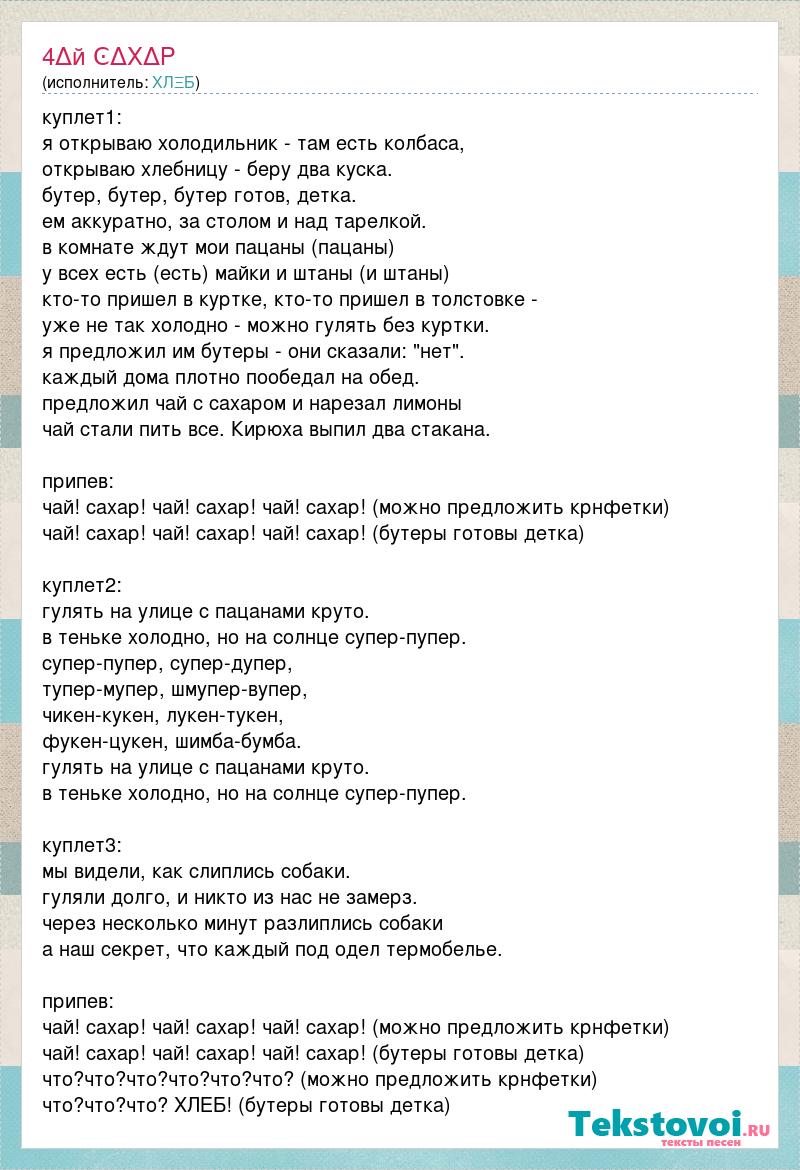 куплет1: я открываю холодильник - там есть колбаса, открываю хлебницу - беру два куска. бутер, бутер, бутер готов, детка. ем аккуратно, за столом и над тарелкой. в комнате ждут мои пацаны (пацаны) у всех есть (есть) майки и штаны (и штаны) кто-то пришел в куртке, кто-то пришел в толстовке - уже не так холодно - можно гулять без куртки. я предложил им бутеры - они сказали: "нет". каждый дома плотно пообедал на обед. предложил чай с сахаром и нарезал лимоны чай стали пить все. Кирюха выпил два стакана. припев: чай! сахар! чай! сахар! чай! сахар! (можно предложить крнфетки) чай! сахар! чай! сахар! чай! сахар! (бутеры готовы детка) куплет2: гулять на улице с пацанами круто. в теньке холодно, но на солнце супер-пупер. супер-пупер, супер-дупер, тупер-мупер, шмупер-вупер, чикен-кукен, лукен-тукен, фукен-цукен, шимба-бумба. гулять на улице с пацанами круто. в теньке холодно, но на солнце супер-пупер. куплет3: мы видели, как слиплись собаки. гуляли долго, и никто из нас не замерз. через несколько минут разлиплись собаки а наш секрет, что каждый под одел термобелье. припев: чай! сахар! чай! сахар! чай! сахар! (можно предложить крнфетки) чай! сахар! чай! сахар! чай! сахар! (бутеры готовы детка) что?что?что?что?что?что? (можно предложить крнфетки) что?что?что? ХЛЕБ! (бутеры готовы детка)