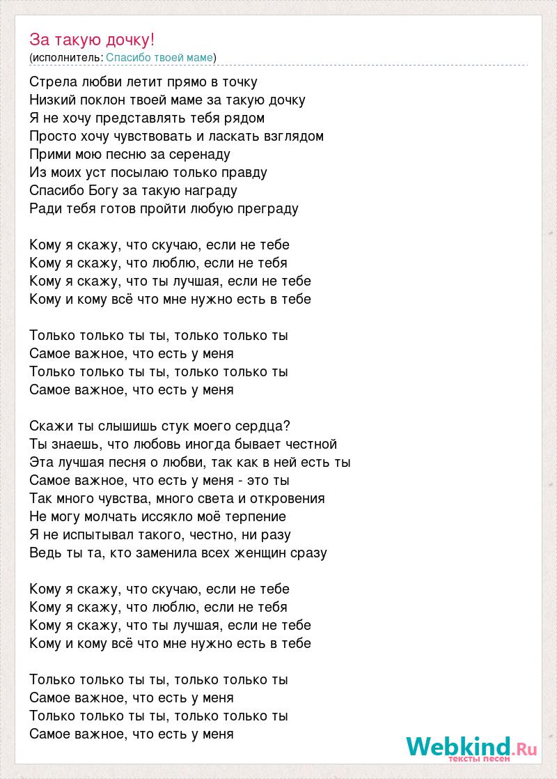 Стрела любви летит прямо в точку Низкий поклон твоей маме за такую дочку Я не хочу представлять тебя рядом Просто хочу чувствовать и ласкать взглядом Прими мою песню за серенаду Из моих уст посылаю только правду Спасибо Богу за такую награду Ради тебя готов пройти любую преграду Кому я скажу, что скучаю, если не тебе Кому я скажу, что люблю, если не тебя Кому я скажу, что ты лучшая, если не тебе Кому и кому всё что мне нужно есть в тебе Только только ты ты, только только ты Самое важное, что есть у меня Только только ты ты, только только ты Самое важное, что есть у меня Скажи ты слышишь стук моего сердца? Ты знаешь, что любовь иногда бывает честной Эта лучшая песня о любви, так как в ней есть ты Самое важное, что есть у меня - это ты Так много чувства, много света и откровения Не могу молчать иссякло моё терпение Я не испытывал такого, честно, ни разу Ведь ты та, кто заменила всех женщин сразу Кому я скажу, что скучаю, если не тебе Кому я скажу, что люблю, если не тебя Кому я скажу, что ты лучшая, если не тебе Кому и кому всё что мне нужно есть в тебе Только только ты ты, только только ты Самое важное, что есть у меня Только только ты ты, только только ты Самое важное, что есть у меня