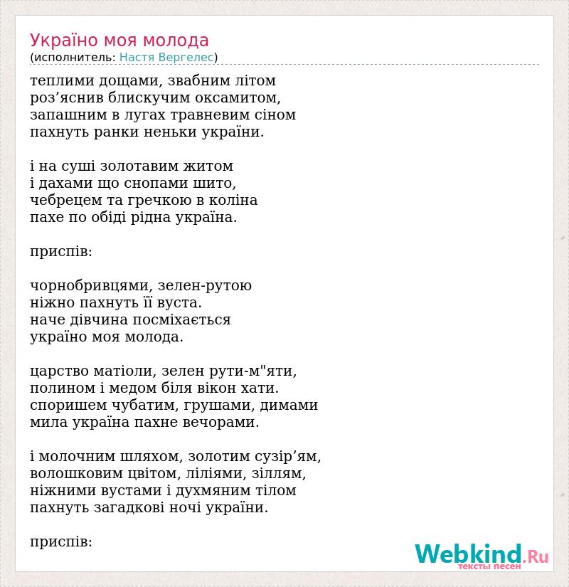 теплими дощами, звабним літом роз’яснив блискучим оксамитом, запашним в лугах травневим сіном пахнуть ранки неньки україни. і на суші золотавим житом і дахами що снопами шито, чебрецем та гречкою в коліна пахе по обіді рідна україна. приспів: чорнобривцями, зелен-рутою ніжно пахнуть її вуста. наче дівчина посміхається україно моя молода. царство матіоли, зелен рути-м"яти, полином і медом біля вікон хати. споришем чубатим, грушами, димами мила україна пахне вечорами. і молочним шляхом, золотим сузір’ям, волошковим цвітом, ліліями, зіллям, ніжними вустами і духмяним тілом пахнуть загадкові ночі україни. приспів: