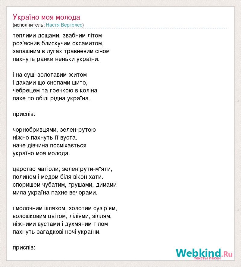 теплими дощами, звабним літом роз’яснив блискучим оксамитом, запашним в лугах травневим сіном пахнуть ранки неньки україни. і на суші золотавим житом і дахами що снопами шито, чебрецем та гречкою в коліна пахе по обіді рідна україна. приспів: чорнобривцями, зелен-рутою ніжно пахнуть її вуста. наче дівчина посміхається україно моя молода. царство матіоли, зелен рути-м"яти, полином і медом біля вікон хати. споришем чубатим, грушами, димами мила україна пахне вечорами. і молочним шляхом, золотим сузір’ям, волошковим цвітом, ліліями, зіллям, ніжними вустами і духмяним тілом пахнуть загадкові ночі україни. приспів: