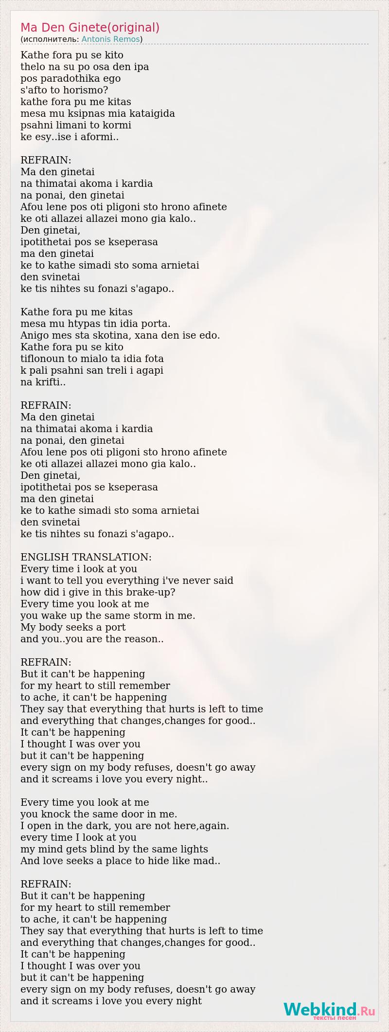 Kathe fora pu se kito thelo na su po osa den ipa pos paradothika ego s'afto to horismo? kathe fora pu me kitas mesa mu ksipnas mia kataigida psahni limani to kormi ke esy..ise i aformi.. REFRAIN: Ma den ginetai na thimatai akoma i kardia na ponai, den ginetai Afou lene pos oti pligoni sto hrono afinete ke oti allazei allazei mono gia kalo.. Den ginetai, ipotithetai pos se kseperasa ma den ginetai ke to kathe simadi sto soma arnietai den svinetai ke tis nihtes su fonazi s'agapo.. Kathe fora pu me kitas mesa mu htypas tin idia porta. Anigo mes sta skotina, xana den ise edo. Kathe fora pu se kito tiflonoun to mialo ta idia fota k pali psahni san treli i agapi na krifti.. REFRAIN: Ma den ginetai na thimatai akoma i kardia na ponai, den ginetai Afou lene pos oti pligoni sto hrono afinete ke oti allazei allazei mono gia kalo.. Den ginetai, ipotithetai pos se kseperasa ma den ginetai ke to kathe simadi sto soma arnietai den svinetai ke tis nihtes su fonazi s'agapo.. ENGLISH TRANSLATION: Every time i look at you i want to tell you everything i've never said how did i give in this brake-up? Every time you look at me you wake up the same storm in me. My body seeks a port and you..you are the reason.. REFRAIN: But it can't be happening for my heart to still remember to ache, it can't be happening They say that everything that hurts is left to time and everything that changes,changes for good.. It can't be happening I thought I was over you but it can't be happening every sign on my body refuses, doesn't go away and it screams i love you every night.. Every time you look at me you knock the same door in me. I open in the dark, you are not here,again. every time I look at you my mind gets blind by the same lights And love seeks a place to hide like mad.. REFRAIN: But it can't be happening for my heart to still remember to ache, it can't be happening They say that everything that hurts is left to time and everything that changes,changes for good.. It can't be happening I thought I was over you but it can't be happening every sign on my body refuses, doesn't go away and it screams i love you every night
