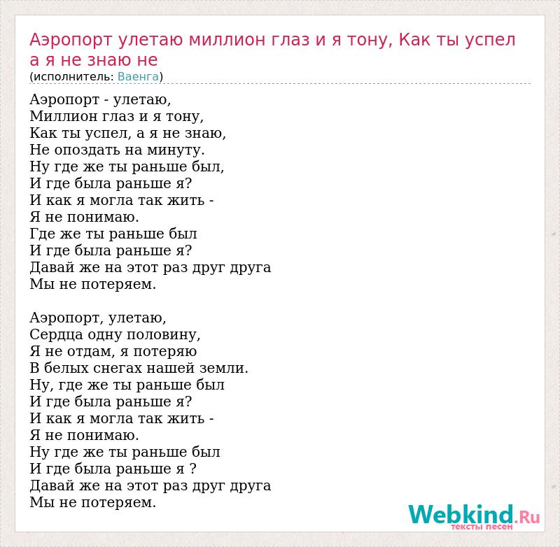 Аэропорт - улетаю, Миллион глаз и я тону, Как ты успел, а я не знаю, Не опоздать на минуту. Ну где же ты раньше был, И где была раньше я? И как я могла так жить - Я не понимаю. Где же ты раньше был И где была раньше я? Давай же на этот раз друг друга Мы не потеряем. Аэропорт, улетаю, Сердца одну половину, Я не отдам, я потеряю В белых снегах нашей земли. Ну, где же ты раньше был И где была раньше я? И как я могла так жить - Я не понимаю. Ну где же ты раньше был И где была раньше я ? Давай же на этот раз друг друга Мы не потеряем.