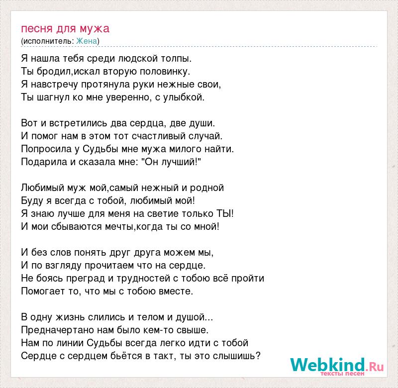 Я нашла тебя среди людской толпы. Ты бродил,искал вторую половинку. Я навстречу протянула руки нежные свои, Ты шагнул ко мне уверенно, с улыбкой. Вот и встретились два сердца, две души. И помог нам в этом тот счастливый случай. Попросила у Судьбы мне мужа милого найти. Подарила и сказала мне: "Он лучший!" Любимый муж мой,самый нежный и родной Буду я всегда с тобой, любимый мой! Я знаю лучше для меня на светие только ТЫ! И мои сбываются мечты,когда ты со мной! И без слов понять друг друга можем мы, И по взгляду прочитаем что на сердце. Не боясь преград и трудностей с тобою всё пройти Помогает то, что мы с тобою вместе. В одну жизнь слились и телом и душой... Предначертано нам было кем-то свыше. Нам по линии Судьбы всегда легко идти с тобой Сердце с сердцем бьётся в такт, ты это слышишь?