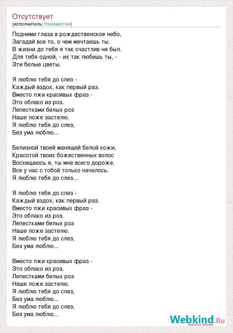 Подними глаза в рождественское небо, Загадай все то, о чем мечтаешь ты. В жизни до тебя я так счастлив не был. Для тебя одной, - их так любишь ты, - Эти белые цветы. Я люблю тебя до слез - Каждый вздох, как первый раз. Вместо лжи красивых фраз - Это облако из роз. Лепестками белых роз Наше ложе застелю. Я люблю тебя до слез, Без ума люблю... Белизной твоей манящей белой кожи, Красотой твоих божественных волос Восхищаюсь я, ты мне всего дороже, Все у нас с тобой только началось. Я люблю тебя до слез... Я люблю тебя до слез - Каждый вздох, как первый раз. Вместо лжи красивых фраз - Это облако из роз. Лепестками белых роз Наше ложе застелю. Я люблю тебя до слез, Без ума люблю... Вместо лжи красивых фраз - Это облако из роз. Лепестками белых роз Наше ложе застелю. Я люблю тебя до слез, Без ума люблю... Я люблю тебя до слез, Без ума люблю...