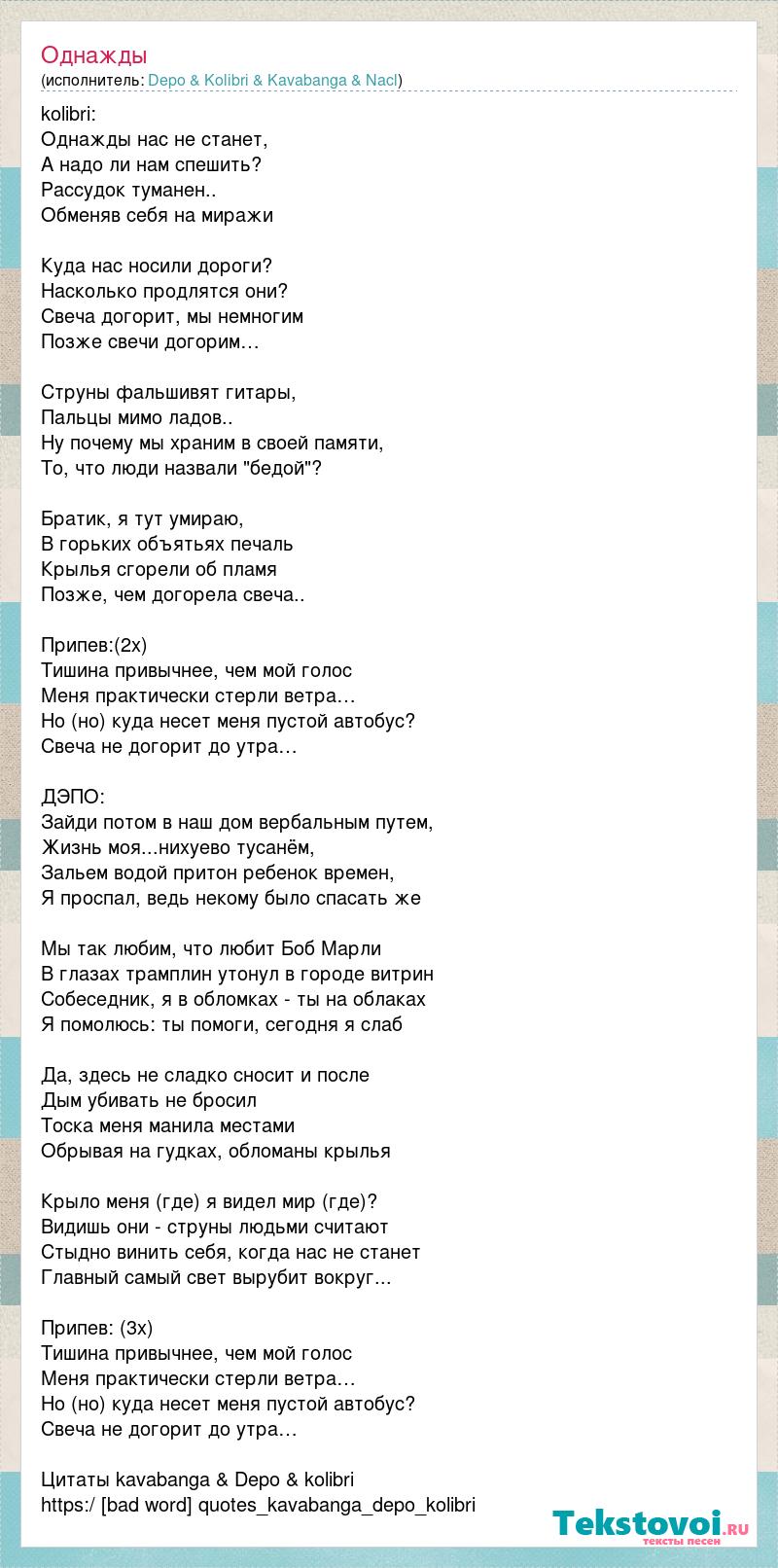 kolibri: Однажды нас не станет, А надо ли нам спешить? Рассудок туманен.. Обменяв себя на миражи Куда нас носили дороги? Насколько продлятся они? Свеча догорит, мы немногим Позже свечи догорим… Струны фальшивят гитары, Пальцы мимо ладов.. Ну почему мы храним в своей памяти, То, что люди назвали "бедой"? Братик, я тут умираю, В горьких объятьях печаль Крылья сгорели об пламя Позже, чем догорела свеча.. Припев:(2х) Тишина привычнее, чем мой голос Меня практически стерли ветра… Но (но) куда несет меня пустой автобус? Свеча не догорит до утра… ДЭПО: Зайди потом в наш дом вербальным путем, Жизнь моя...нихуево тусанём, Зальем водой притон ребенок времен, Я проспал, ведь некому было спасать же Мы так любим, что любит Боб Марли В глазах трамплин утонул в городе витрин Собеседник, я в обломках - ты на облаках Я помолюсь: ты помоги, сегодня я слаб Да, здесь не сладко сносит и после Дым убивать не бросил Тоска меня манила местами Обрывая на гудках, обломаны крылья Крыло меня (где) я видел мир (где)? Видишь они - струны людьми считают Стыдно винить себя, когда нас не станет Главный самый свет вырубит вокруг... Припев: (3х) Тишина привычнее, чем мой голос Меня практически стерли ветра… Но (но) куда несет меня пустой автобус? Свеча не догорит до утра… Цитаты kavabanga & Depo & kolibri https:/ [bad word] quotes_kavabanga_depo_kolibri