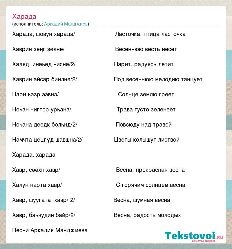 Харада, шовун харада/ Ласточка, птица ласточка Хаврин зәңг зѳѳнә/ Весеннюю весть несёт Халяд, инәһәд ниснә/2/ Парит, радуясь летит Хаврин айсар биилнә/2/ Под весеннюю мелодию танцует Нарн һазр ээвнә/ Солнце землю греет Ноһан нигтәр урһана/ Трава густо зеленеет Ноһана деедк болһнд/2/ Повсюду над травой Намчта цецгүд шавшна/2/ Цветы колышут листвой Харада, харада Хавр, сәәхн хавр/ Весна, прекрасная весна Халун нарта хавр/ С горячим солнцем весна Хавр, шуугата хавр/ 2/ Весна, шумная весна Хавр, баһчудин байр/2/ Весна, радость молодых Песни Аркадия Манджиева