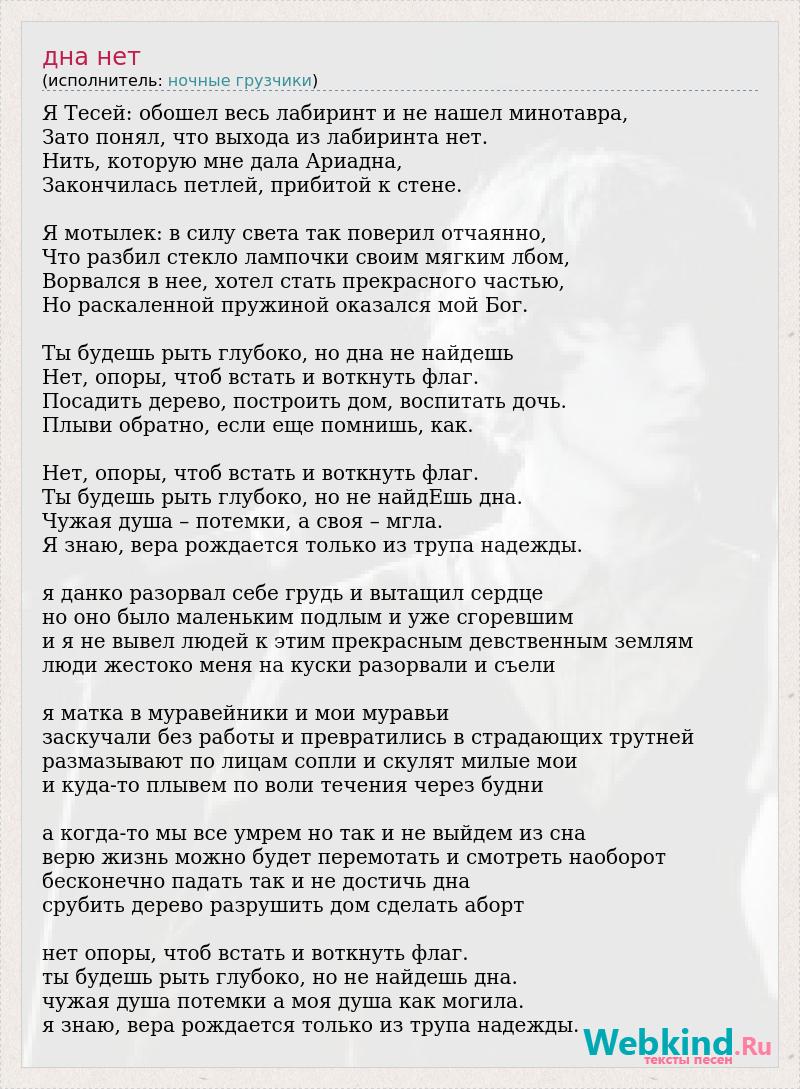 Я Тесей: обошел весь лабиринт и не нашел минотавра, Зато понял, что выхода из лабиринта нет. Нить, которую мне дала Ариадна, Закончилась петлей, прибитой к стене. Я мотылек: в силу света так поверил отчаянно, Что разбил стекло лампочки своим мягким лбом, Ворвался в нее, хотел стать прекрасного частью, Но раскаленной пружиной оказался мой Бог. Ты будешь рыть глубоко, но дна не найдешь Нет, опоры, чтоб встать и воткнуть флаг. Посадить дерево, построить дом, воспитать дочь. Плыви обратно, если еще помнишь, как. Нет, опоры, чтоб встать и воткнуть флаг. Ты будешь рыть глубоко, но не найдЕшь дна. Чужая душа – потемки, а своя – мгла. Я знаю, вера рождается только из трупа надежды. я данко разорвал себе грудь и вытащил сердце но оно было маленьким подлым и уже сгоревшим и я не вывел людей к этим прекрасным девственным землям люди жестоко меня на куски разорвали и съели я матка в муравейники и мои муравьи заскучали без работы и превратились в страдающих трутней размазывают по лицам сопли и скулят милые мои и куда-то плывем по воли течения через будни а когда-то мы все умрем но так и не выйдем из сна верю жизнь можно будет перемотать и смотреть наоборот бесконечно падать так и не достичь дна срубить дерево разрушить дом сделать аборт нет опоры, чтоб встать и воткнуть флаг. ты будешь рыть глубоко, но не найдешь дна. чужая душа потемки а моя душа как могила. я знаю, вера рождается только из трупа надежды.