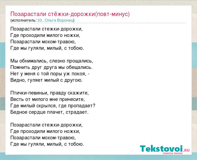 Позарастали стежки-дорожки, Где проходили милого ножки, Позарастали мохом-травою, Где мы гуляли, милый, с тобою. Мы обнимались, слезно прощались, Помнить друг друга мы обещались. Нет у меня с той поры уж покоя, - Видно, гуляет милый с другою. Птички-певиньи, правду скажите, Весть от милого мне принесите, Где милый скрылся, где пропадает? Бедное сердце плачет, страдает. Позарастали стежки-дорожки, Где проходили милого ножки, Позарастали мохом-травою, Где мы гуляли, милый, с тобою.