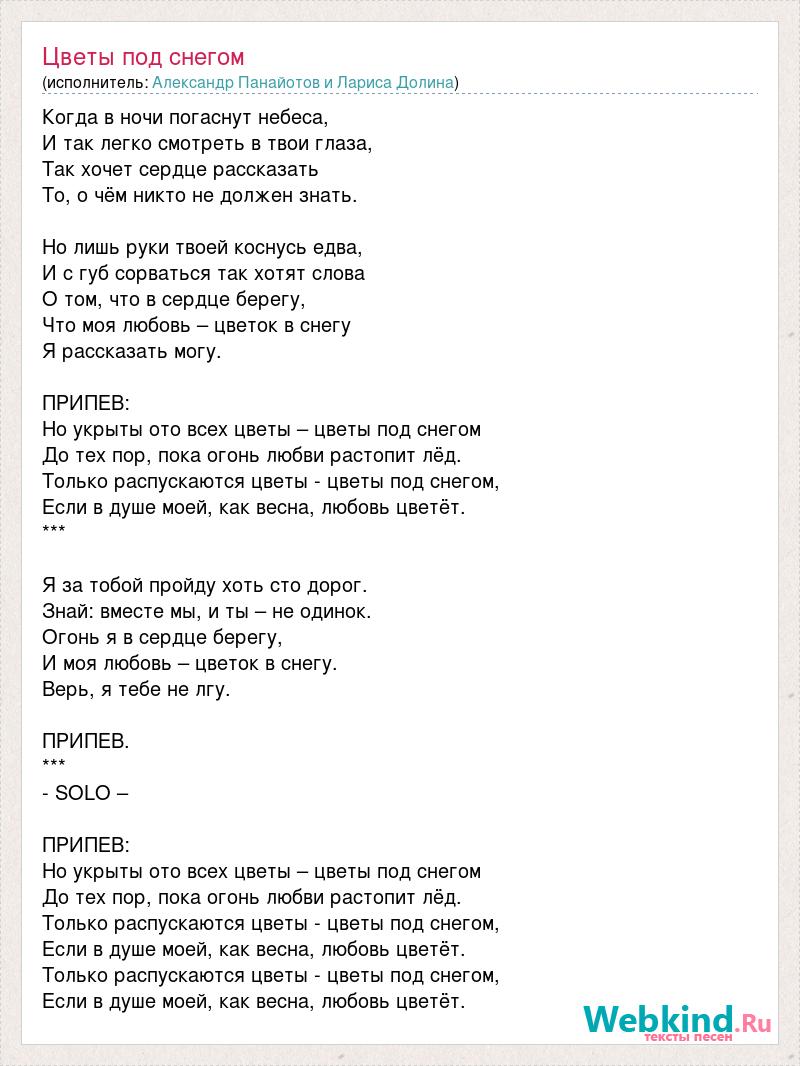 Когда в ночи погаснут небеса, И так легко смотреть в твои глаза, Так хочет сердце рассказать То, о чём никто не должен знать. Но лишь руки твоей коснусь едва, И с губ сорваться так хотят слова О том, что в сердце берегу, Что моя любовь – цветок в снегу Я рассказать могу. ПРИПЕВ: Но укрыты ото всех цветы – цветы под снегом До тех пор, пока огонь любви растопит лёд. Только распускаются цветы - цветы под снегом, Если в душе моей, как весна, любовь цветёт. *** Я за тобой пройду хоть сто дорог. Знай: вместе мы, и ты – не одинок. Огонь я в сердце берегу, И моя любовь – цветок в снегу. Верь, я тебе не лгу. ПРИПЕВ. *** - SOLO – ПРИПЕВ: Но укрыты ото всех цветы – цветы под снегом До тех пор, пока огонь любви растопит лёд. Только распускаются цветы - цветы под снегом, Если в душе моей, как весна, любовь цветёт. Только распускаются цветы - цветы под снегом, Если в душе моей, как весна, любовь цветёт.