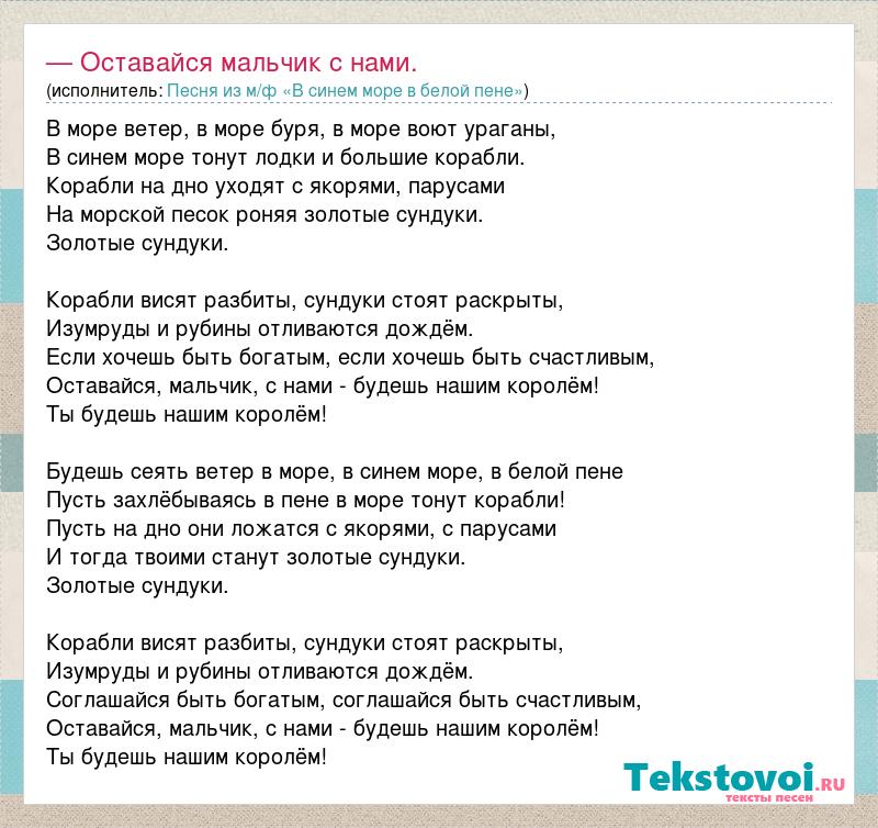 В море ветер, в море буря, в море воют ураганы, В синем море тонут лодки и большие корабли. Корабли на дно уходят с якорями, парусами На морской песок роняя золотые сундуки. Золотые сундуки. Корабли висят разбиты, сундуки стоят раскрыты, Изумруды и рубины отливаются дождём. Если хочешь быть богатым, если хочешь быть счастливым, Оставайся, мальчик, с нами - будешь нашим королём! Ты будешь нашим королём! Будешь сеять ветер в море, в синем море, в белой пене Пусть захлёбываясь в пене в море тонут корабли! Пусть на дно они ложатся с якорями, с парусами И тогда твоими станут золотые сундуки. Золотые сундуки. Корабли висят разбиты, сундуки стоят раскрыты, Изумруды и рубины отливаются дождём. Соглашайся быть богатым, соглашайся быть счастливым, Оставайся, мальчик, с нами - будешь нашим королём! Ты будешь нашим королём!
