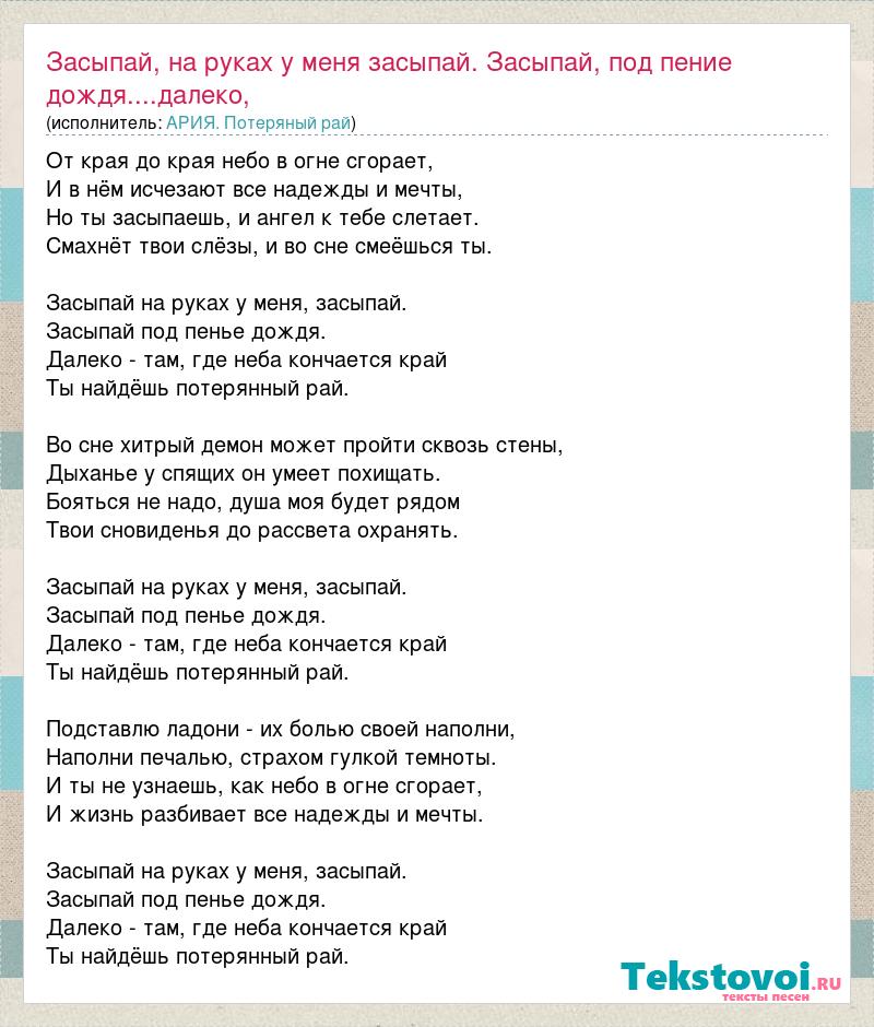 Главная→Исполнители→АРИЯ. Потеряный рай→Засыпай, на руках у меня засыпай. Засыпай, под пение дождя....далеко, там г
