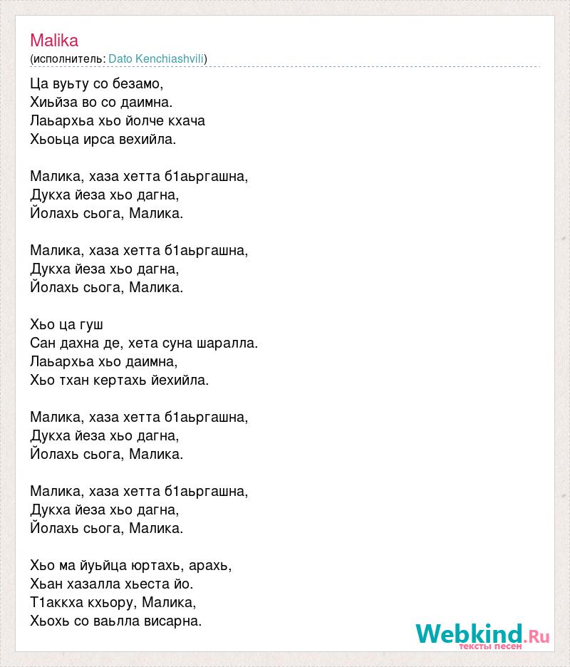 Ца вуьту со безамо, Хиьйза во со даимна. Лаьархьа хьо йолче кхача Хьоьца ирса вехийла. Малика, хаза хетта б1аьргашна, Дукха йеза хьо дагна, Йолахь сьога, Малика. Малика, хаза хетта б1аьргашна, Дукха йеза хьо дагна, Йолахь сьога, Малика. Хьо ца гуш Сан дахна де, хета суна шаралла. Лаьархьа хьо даимна, Хьо тхан кертахь йехийла. Малика, хаза хетта б1аьргашна, Дукха йеза хьо дагна, Йолахь сьога, Малика. Малика, хаза хетта б1аьргашна, Дукха йеза хьо дагна, Йолахь сьога, Малика. Хьо ма йуьйца юртахь, арахь, Хьан хазалла хьеста йо. Т1аккха кхьору, Малика, Хьохь со ваьлла висарна.