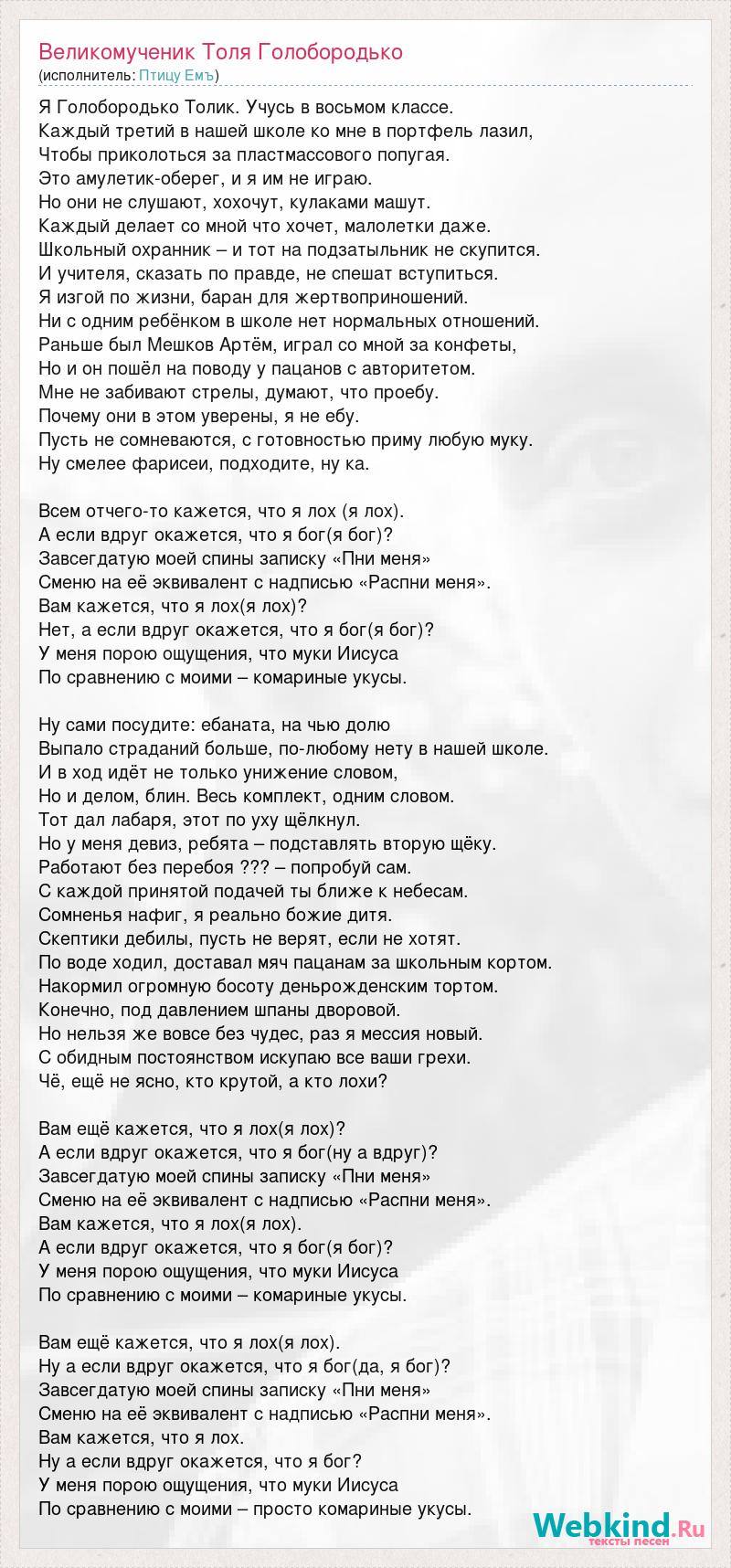 Я Голобородько Толик. Учусь в восьмом классе. Каждый третий в нашей школе ко мне в портфель лазил, Чтобы приколоться за пластмассового попугая. Это амулетик-оберег, и я им не играю. Но они не слушают, хохочут, кулаками машут. Каждый делает со мной что хочет, малолетки даже. Школьный охранник – и тот на подзатыльник не скупится. И учителя, сказать по правде, не спешат вступиться. Я изгой по жизни, баран для жертвоприношений. Ни с одним ребёнком в школе нет нормальных отношений. Раньше был Мешков Артём, играл со мной за конфеты, Но и он пошёл на поводу у пацанов с авторитетом. Мне не забивают стрелы, думают, что проебу. Почему они в этом уверены, я не ебу. Пусть не сомневаются, с готовностью приму любую муку. Ну смелее фарисеи, подходите, ну ка. Всем отчего-то кажется, что я лох (я лох). А если вдруг окажется, что я бог(я бог)? Завсегдатую моей спины записку «Пни меня» Сменю на её эквивалент с надписью «Распни меня». Вам кажется, что я лох(я лох)? Нет, а если вдруг окажется, что я бог(я бог)? У меня порою ощущения, что муки Иисуса По сравнению с моими – комариные укусы. Ну сами посудите: ебаната, на чью долю Выпало страданий больше, по-любому нету в нашей школе. И в ход идёт не только унижение словом, Но и делом, блин. Весь комплект, одним словом. Тот дал лабаря, этот по уху щёлкнул. Но у меня девиз, ребята – подставлять вторую щёку. Работают без перебоя ??? – попробуй сам. С каждой принятой подачей ты ближе к небесам. Сомненья нафиг, я реально божие дитя. Скептики дебилы, пусть не верят, если не хотят. По воде ходил, доставал мяч пацанам за школьным кортом. Накормил огромную босоту деньрожденским тортом. Конечно, под давлением шпаны дворовой. Но нельзя же вовсе без чудес, раз я мессия новый. С обидным постоянством искупаю все ваши грехи. Чё, ещё не ясно, кто крутой, а кто лохи? Вам ещё кажется, что я лох(я лох)? А если вдруг окажется, что я бог(ну а вдруг)? Завсегдатую моей спины записку «Пни меня» Сменю на её эквивалент с надписью «Распни меня». Вам кажется, что я лох(я лох). А если вдруг окажется, что я бог(я бог)? У меня порою ощущения, что муки Иисуса По сравнению с моими – комариные укусы. Вам ещё кажется, что я лох(я лох). Ну а если вдруг окажется, что я бог(да, я бог)? Завсегдатую моей спины записку «Пни меня» Сменю на её эквивалент с надписью «Распни меня». Вам кажется, что я лох. Ну а если вдруг окажется, что я бог? У меня порою ощущения, что муки Иисуса По сравнению с моими – просто комариные укусы.