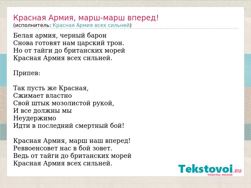 Белая армия, черный барон Снова готовят нам царский трон. Но от тайги до британских морей Красная Армия всех сильней. Припев: Так пусть же Красная, Сжимает властно Свой штык мозолистой рукой, И все должны мы Неудержимо Идти в последний смертный бой! Красная Армия, марш наш вперед! Реввоенсовет нас в бой зовет. Ведь от тайги до британских морей Красная Армия всех сильней.