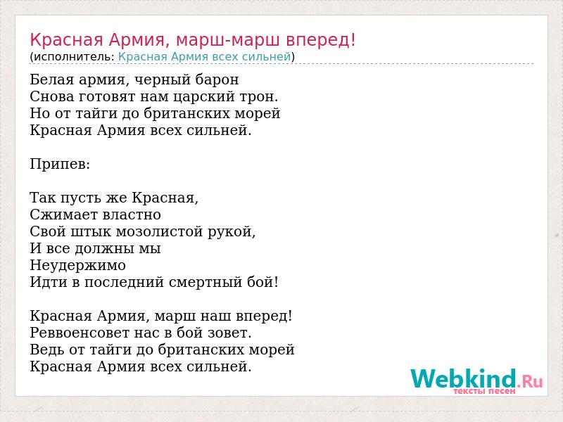 Белая армия, черный барон Снова готовят нам царский трон. Но от тайги до британских морей Красная Армия всех сильней. Припев: Так пусть же Красная, Сжимает властно Свой штык мозолистой рукой, И все должны мы Неудержимо Идти в последний смертный бой! Красная Армия, марш наш вперед! Реввоенсовет нас в бой зовет. Ведь от тайги до британских морей Красная Армия всех сильней.