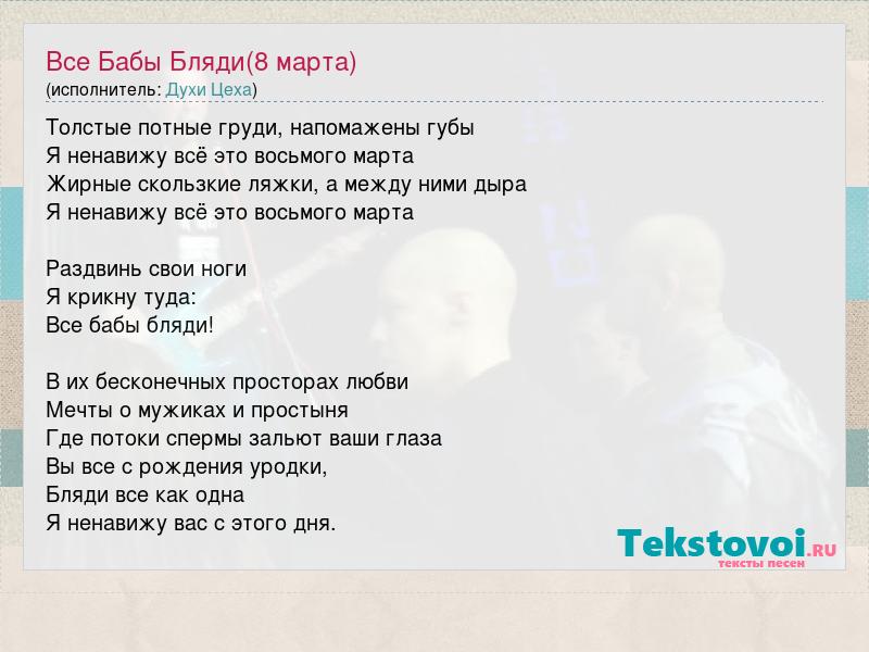 Толстые потные груди, напомажены губы Я ненавижу всё это восьмого марта Жирные скользкие ляжки, а между ними дыра Я ненавижу всё это восьмого марта Раздвинь свои ноги Я крикну туда: Все бабы бляди! В их бесконечных просторах любви Мечты о мужиках и простыня Где потоки спермы зальют ваши глаза Вы все с рождения уродки, Бляди все как одна Я ненавижу вас с этого дня.