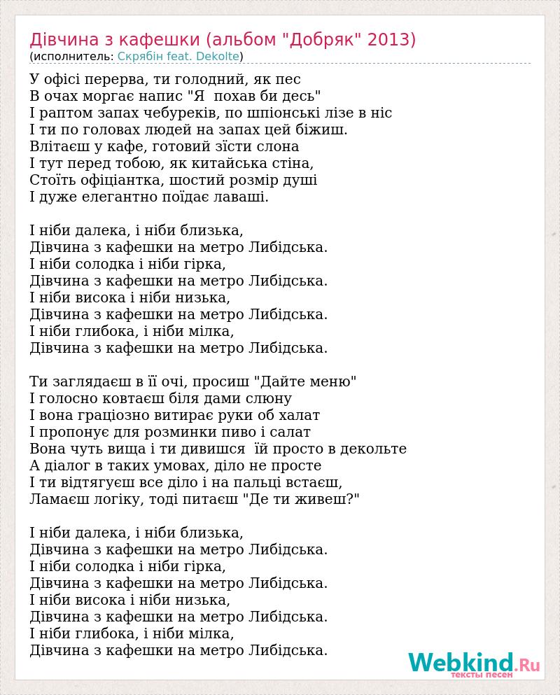 У офісі перерва, ти голодний, як пес В очах моргає напис "Я похав би десь" І раптом запах чебуреків, по шпіонські лізе в ніс І ти по головах людей на запах цей біжиш. Влітаєш у кафе, готовий зїсти слона І тут перед тобою, як китайська стіна, Стоїть офіціантка, шостий розмір душі І дуже елегантно поїдає лаваші. І ніби далека, і ніби близька, Дівчина з кафешки на метро Либідська. І ніби солодка і ніби гірка, Дівчина з кафешки на метро Либідська. І ніби висока і ніби низька, Дівчина з кафешки на метро Либідська. І ніби глибока, і ніби мілка, Дівчина з кафешки на метро Либідська. Ти заглядаєш в її очі, просиш "Дайте меню" І голосно ковтаєш біля дами слюну І вона граціозно витирає руки об халат І пропонує для розминки пиво і салат Вона чуть вища і ти дивишся їй просто в декольте А діалог в таких умовах, діло не просте І ти відтягуєш все діло і на пальці встаєш, Ламаєш логіку, тоді питаєш "Де ти живеш?" І ніби далека, і ніби близька, Дівчина з кафешки на метро Либідська. І ніби солодка і ніби гірка, Дівчина з кафешки на метро Либідська. І ніби висока і ніби низька, Дівчина з кафешки на метро Либідська. І ніби глибока, і ніби мілка, Дівчина з кафешки на метро Либідська.