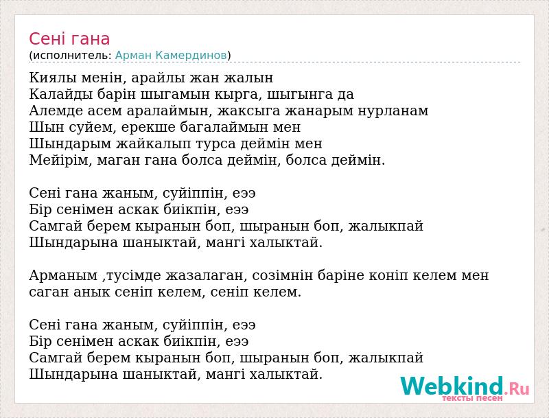 Киялы менiн, арайлы жан жалын Калайды барiн шыгамын кырга, шыгынга да Алемде асем аралаймын, жаксыга жанарым нурланам Шын суйем, ерекше багалаймын мен Шындарым жайкалып турса деймiн мен Мейiрiм, маган гана болса деймiн, болса деймiн. Сенi гана жаным, суйiппiн, еээ Бiр сенiмен аскак биiкпiн, еээ Самгай берем кыранын боп, шыранын боп, жалыкпай Шындарына шаныктай, мангi халыктай. Арманым ,тусiмде жазалаган, созiмнiн барiне конiп келем мен саган анык сенiп келем, сенiп келем. Сенi гана жаным, суйiппiн, еээ Бiр сенiмен аскак биiкпiн, еээ Самгай берем кыранын боп, шыранын боп, жалыкпай Шындарына шаныктай, мангi халыктай.