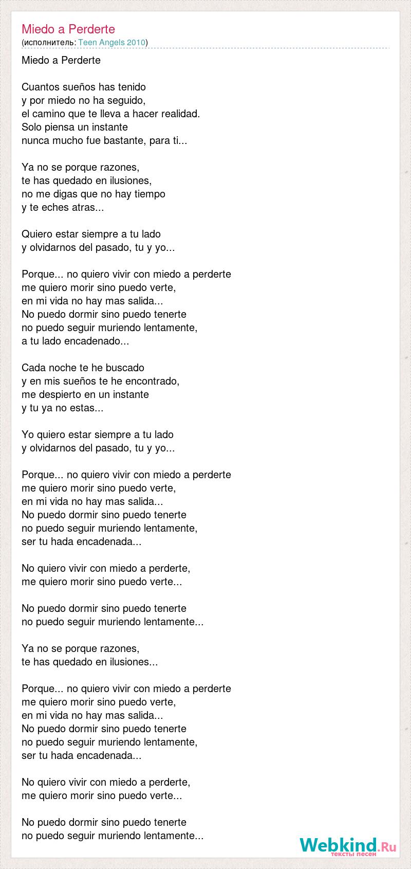Miedo a Perderte Cuantos sueños has tenido y por miedo no ha seguido, el camino que te lleva a hacer realidad. Solo piensa un instante nunca mucho fue bastante, para ti... Ya no se porque razones, te has quedado en ilusiones, no me digas que no hay tiempo y te eches atras... Quiero estar siempre a tu lado y olvidarnos del pasado, tu y yo... Porque... no quiero vivir con miedo a perderte me quiero morir sino puedo verte, en mi vida no hay mas salida... No puedo dormir sino puedo tenerte no puedo seguir muriendo lentamente, a tu lado encadenado... Cada noche te he buscado y en mis sueños te he encontrado, me despierto en un instante y tu ya no estas... Yo quiero estar siempre a tu lado y olvidarnos del pasado, tu y yo... Porque... no quiero vivir con miedo a perderte me quiero morir sino puedo verte, en mi vida no hay mas salida... No puedo dormir sino puedo tenerte no puedo seguir muriendo lentamente, ser tu hada encadenada... No quiero vivir con miedo a perderte, me quiero morir sino puedo verte... No puedo dormir sino puedo tenerte no puedo seguir muriendo lentamente... Ya no se porque razones, te has quedado en ilusiones... Porque... no quiero vivir con miedo a perderte me quiero morir sino puedo verte, en mi vida no hay mas salida... No puedo dormir sino puedo tenerte no puedo seguir muriendo lentamente, ser tu hada encadenada... No quiero vivir con miedo a perderte, me quiero morir sino puedo verte... No puedo dormir sino puedo tenerte no puedo seguir muriendo lentamente...