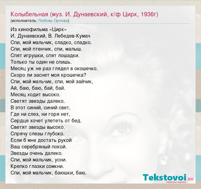 Из кинофильма «Цирк» И. Дунаевский, В. Лебедев-Кумач Спи, мой мальчик, сладко, сладко. Спи, мой птенчик, спи, малыш. Спят игрушки, спят лошадки. Только ты один не спишь. Месяц уж не раз глядел в окошечко. Скоро ли заснет моя крошечка? Спи, мой мальчик, спи, мой зайчик, Ай, баю, баю, бай, бай. Месяц ходит высоко. Светят звезды далеко. В этот синий, синий свет, Где ни слез, ни горя нет, Сердце хочет улететь от бед. Светят звезды высоко. Спрячу слезы глубоко. Если б мне достать рукой Ваш серебряный покой. Звезды очень далеко. Спи, мой мальчик, усни. Крепко глазки сомкни. Спи, мой мальчик, баюшки, баю.