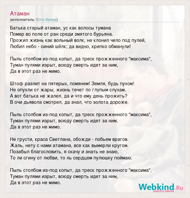 Батька старый атаман, ус как волосы тумана Помер во поле от ран среди змятого бурьяна. Прожил жизнь как вольный волк, не клонил чело под пулей, Любил небо - синий шёлк; да видно, крепко обманули! Пыль столбом из-под копыт, да треск прожженного "максима", Туман пулями изрыт, всюду смерть идет за ним, Да в этот раз не мимо. Штоф разлит на пятерых, помянем! Земля, будь пухом! Не опухли от жары, жизнь течет по глупым слухам. А вот батька не жалел, да и что ему день прожить? В очи дьявола смотрел, да знал, что золота дороже. Пыль столбом из-под копыт, да треск прожженного "максима", Туман пулями изрыт, всюду смерть идет за ним, Да в этот раз не мимо. Не грусти, краса Светлана, обожди - побьем врагов. Жаль, нету с нами атамана, все как вымерли кругом. Позабыл благословить, я скачу и знать не знаю, То ли сгину от любви, то ль сердцем пулюшку поймаю. Пыль столбом из-под копыт, да треск прожженного "максима", Туман пулями изрыт, всюду смерть идет за ним, Да в этот раз не мимо.