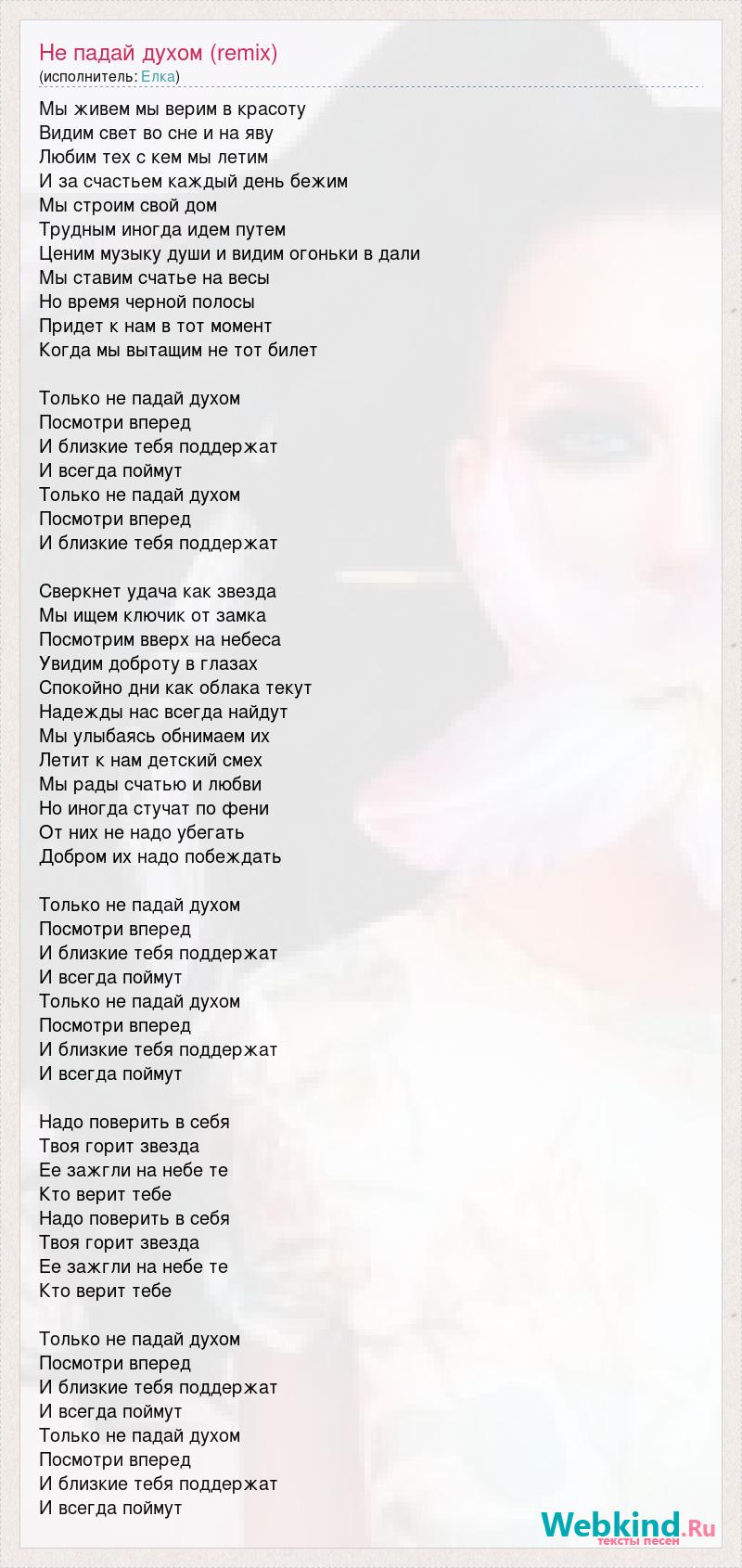 Мы живем мы верим в красоту Видим свет во сне и на яву Любим тех с кем мы летим И за счастьем каждый день бежим Мы строим свой дом Трудным иногда идем путем Ценим музыку души и видим огоньки в дали Мы ставим счатье на весы Но время черной полосы Придет к нам в тот момент Когда мы вытащим не тот билет Только не падай духом Посмотри вперед И близкие тебя поддержат И всегда поймут Только не падай духом Посмотри вперед И близкие тебя поддержат Сверкнет удача как звезда Мы ищем ключик от замка Посмотрим вверх на небеса Увидим доброту в глазах Спокойно дни как облака текут Надежды нас всегда найдут Мы улыбаясь обнимаем их Летит к нам детский смех Мы рады счатью и любви Но иногда стучат по фени От них не надо убегать Добром их надо побеждать Только не падай духом Посмотри вперед И близкие тебя поддержат И всегда поймут Только не падай духом Посмотри вперед И близкие тебя поддержат И всегда поймут Надо поверить в себя Твоя горит звезда Ее зажгли на небе те Кто верит тебе Надо поверить в себя Твоя горит звезда Ее зажгли на небе те Кто верит тебе Только не падай духом Посмотри вперед И близкие тебя поддержат И всегда поймут Только не падай духом Посмотри вперед И близкие тебя поддержат И всегда поймут