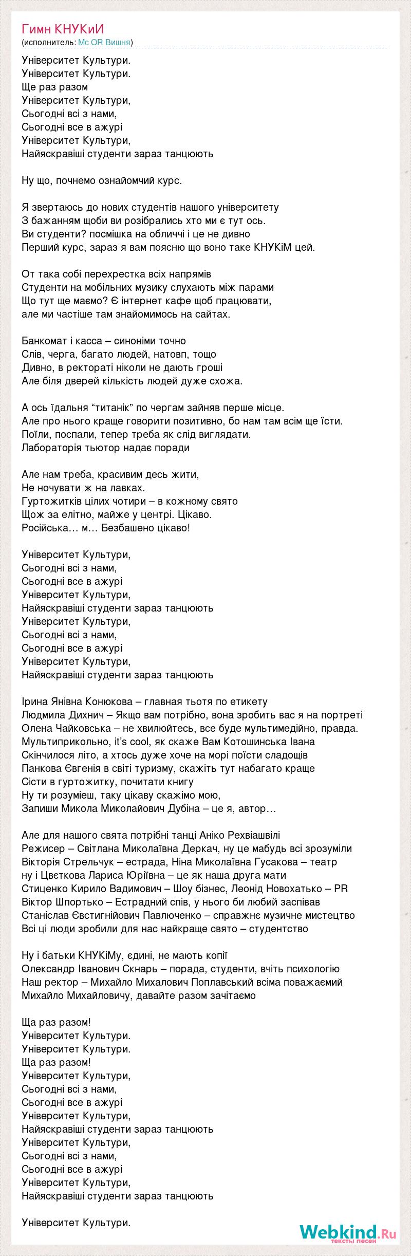 Університет Культури. Університет Культури. Ще раз разом Університет Культури, Сьогодні всі з нами, Сьогодні все в ажурі Університет Культури, Найяскравіші студенти зараз танцюють Ну що, почнемо ознайомчий курс. Я звертаюсь до нових студентів нашого університету З бажанням щоби ви розібрались хто ми є тут ось. Ви студенти? посмішка на обличчі і це не дивно Перший курс, зараз я вам поясню що воно таке КНУКіМ цей. От така собі перехрестка всіх напрямів Студенти на мобільних музику слухають між парами Що тут ще маємо? Є інтернет кафе щоб працювати, але ми частіше там знайомимось на сайтах. Банкомат і касса – синоніми точно Слів, черга, багато людей, натовп, тощо Дивно, в ректораті ніколи не дають гроші Але біля дверей кількість людей дуже схожа. А ось їдальня “титанік” по чергам зайняв перше місце. Але про нього краще говорити позитивно, бо нам там всім ще їсти. Поїли, поспали, тепер треба як слід виглядати. Лабораторія тьютор надає поради Але нам треба, красивим десь жити, Не ночувати ж на лавках. Гуртожитків цілих чотири – в кожному свято Щож за елітно, майже у центрі. Цікаво. Російська… м… Безбашено цікаво! Університет Культури, Сьогодні всі з нами, Сьогодні все в ажурі Університет Культури, Найяскравіші студенти зараз танцюють Університет Культури, Сьогодні всі з нами, Сьогодні все в ажурі Університет Культури, Найяскравіші студенти зараз танцюють Ірина Янівна Конюкова – главная тьотя по етикету Людмила Дихнич – Якщо вам потрібно, вона зробить вас я на портреті Олена Чайковська – не хвилюйтесь, все буде мультимедійно, правда. Мультиприкольно, it’s cool, як скаже Вам Котошинська Івана Скінчилося літо, а хтось дуже хоче на морі поїсти сладощів Панкова Євгенія в світі туризму, скажіть тут набагато краще Сісти в гуртожитку, почитати книгу Ну ти розуміеш, таку цікаву скажімо мою, Запиши Микола Миколайович Дубіна – це я, автор… Але для нашого свята потрібні танці Аніко Рехвіашвілі Режисер – Світлана Миколаївна Деркач, ну це мабудь всі зрозуміли Вікторія Стрельчук – естрада, Ніна Миколаївна Гусакова – театр ну і Цвєткова Лариса Юріївна – це як наша друга мати Стиценко Кирило Вадимович – Шоу бізнес, Леонід Новохатько – PR Віктор Шпортько – Естрадний спів, у нього би любий заспівав Станіслав Євстигнійович Павлюченко – справжнє музичне мистецтво Всі ці люди зробили для нас найкраще свято – студентство Ну і батьки КНУКіМу, єдині, не мають копії Олександр Іванович Скнарь – порада, студенти, вчіть психологію Наш ректор – Михайло Михалович Поплавський всіма поважаємий Михайло Михайловичу, давайте разом зачітаємо Ща раз разом! Університет Культури. Університет Культури. Ща раз разом! Університет Культури, Сьогодні всі з нами, Сьогодні все в ажурі Університет Культури, Найяскравіші студенти зараз танцюють Університет Культури, Сьогодні всі з нами, Сьогодні все в ажурі Університет Культури, Найяскравіші студенти зараз танцюють Університет Культури.