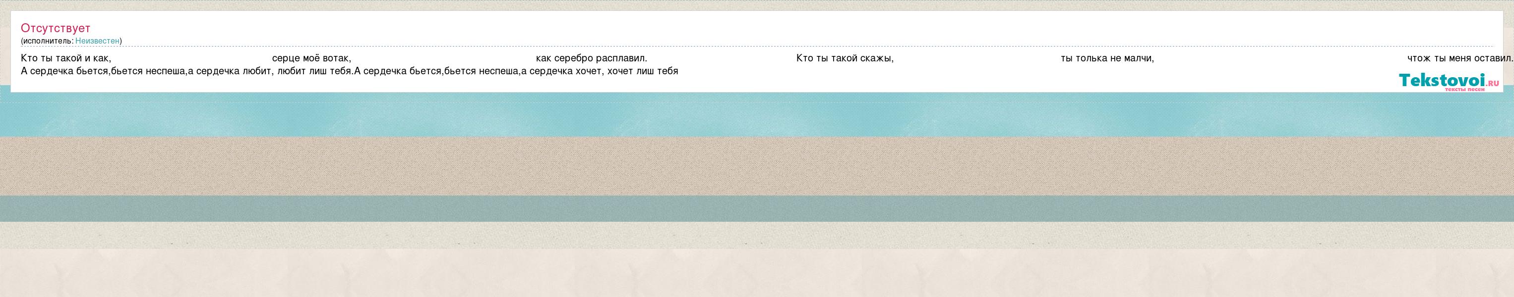 Кто ты такой и как, серце моё вотак, как серебро расплавил. Кто ты такой скажы, ты толька не малчи, чтож ты меня оставил. А сердечка бьется,бьется неспеша,а сердечка любит, любит лиш тебя.А сердечка бьется,бьется неспеша,а сердечка хочет, хочет лиш тебя