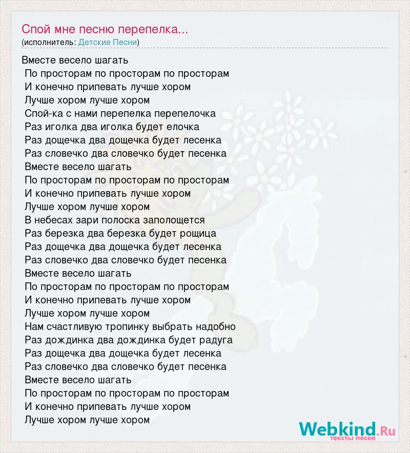 Вместе весело шагать По просторам по просторам по просторам И конечно припевать лучше хором Лучше хором лучше хором Спой-ка с нами перепелка перепелочка Раз иголка два иголка будет елочка Раз дощечка два дощечка будет лесенка Раз словечко два словечко будет песенка Вместе весело шагать По просторам по просторам по просторам И конечно припевать лучше хором Лучше хором лучше хором В небесах зари полоска заполощется Раз березка два березка будет рощица Раз дощечка два дощечка будет лесенка Раз словечко два словечко будет песенка Вместе весело шагать По просторам по просторам по просторам И конечно припевать лучше хором Лучше хором лучше хором Нам счастливую тропинку выбрать надобно Раз дождинка два дождинка будет радуга Раз дощечка два дощечка будет лесенка Раз словечко два словечко будет песенка Вместе весело шагать По просторам по просторам по просторам И конечно припевать лучше хором Лучше хором лучше хором