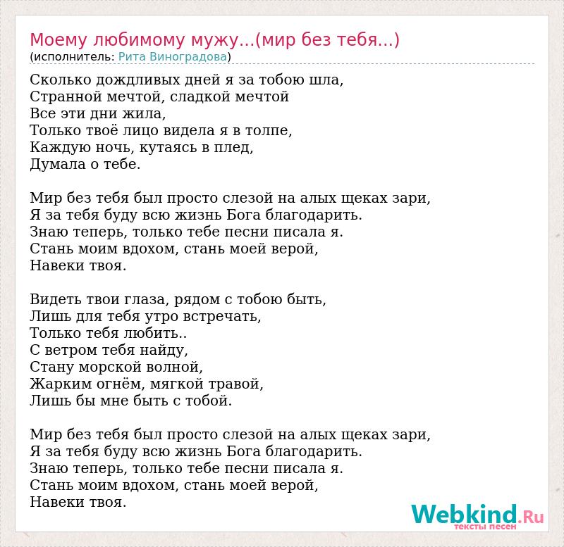 Сколько дождливых дней я за тобою шла, Странной мечтой, сладкой мечтой Все эти дни жила, Только твоё лицо видела я в толпе, Каждую ночь, кутаясь в плед, Думала о тебе. Мир без тебя был просто слезой на алых щеках зари, Я за тебя буду всю жизнь Бога благодарить. Знаю теперь, только тебе песни писала я. Стань моим вдохом, стань моей верой, Навеки твоя. Видеть твои глаза, рядом с тобою быть, Лишь для тебя утро встречать, Только тебя любить.. С ветром тебя найду, Стану морской волной, Жарким огнём, мягкой травой, Лишь бы мне быть с тобой. Мир без тебя был просто слезой на алых щеках зари, Я за тебя буду всю жизнь Бога благодарить. Знаю теперь, только тебе песни писала я. Стань моим вдохом, стань моей верой, Навеки твоя.