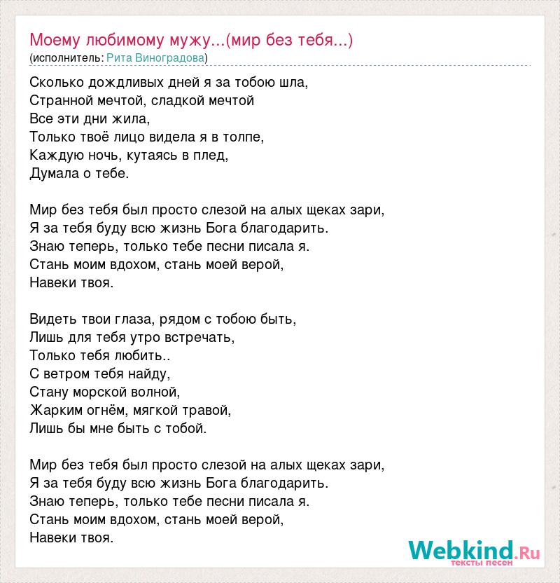 Сколько дождливых дней я за тобою шла, Странной мечтой, сладкой мечтой Все эти дни жила, Только твоё лицо видела я в толпе, Каждую ночь, кутаясь в плед, Думала о тебе. Мир без тебя был просто слезой на алых щеках зари, Я за тебя буду всю жизнь Бога благодарить. Знаю теперь, только тебе песни писала я. Стань моим вдохом, стань моей верой, Навеки твоя. Видеть твои глаза, рядом с тобою быть, Лишь для тебя утро встречать, Только тебя любить.. С ветром тебя найду, Стану морской волной, Жарким огнём, мягкой травой, Лишь бы мне быть с тобой. Мир без тебя был просто слезой на алых щеках зари, Я за тебя буду всю жизнь Бога благодарить. Знаю теперь, только тебе песни писала я. Стань моим вдохом, стань моей верой, Навеки твоя.