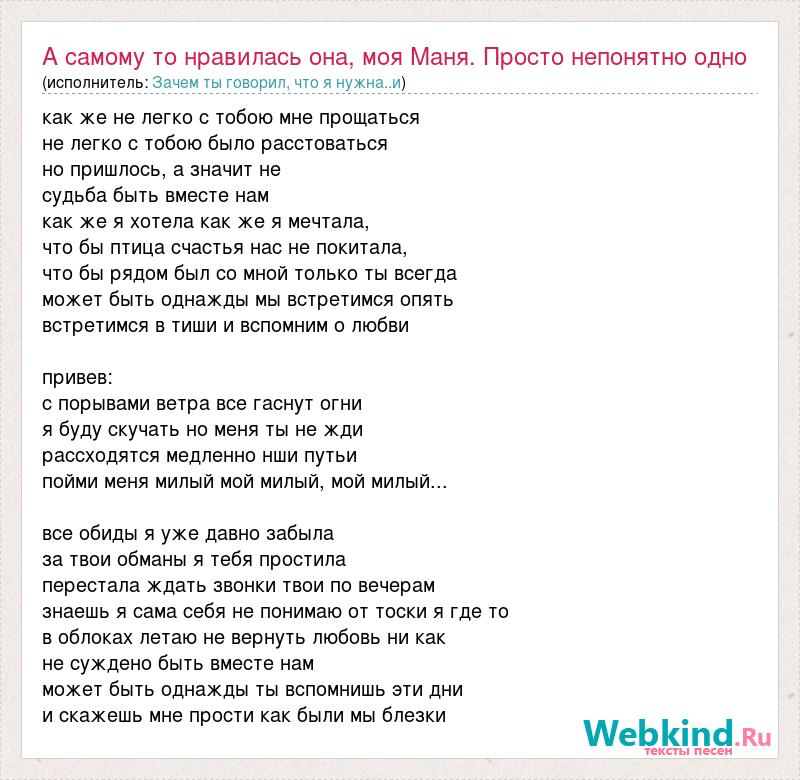 Главная→Исполнители→Зачем ты говорил, что я нужна..и врал что любишь меня??→А самому то нравилась она, моя Маня. Просто непонятно одно неужели было трудн