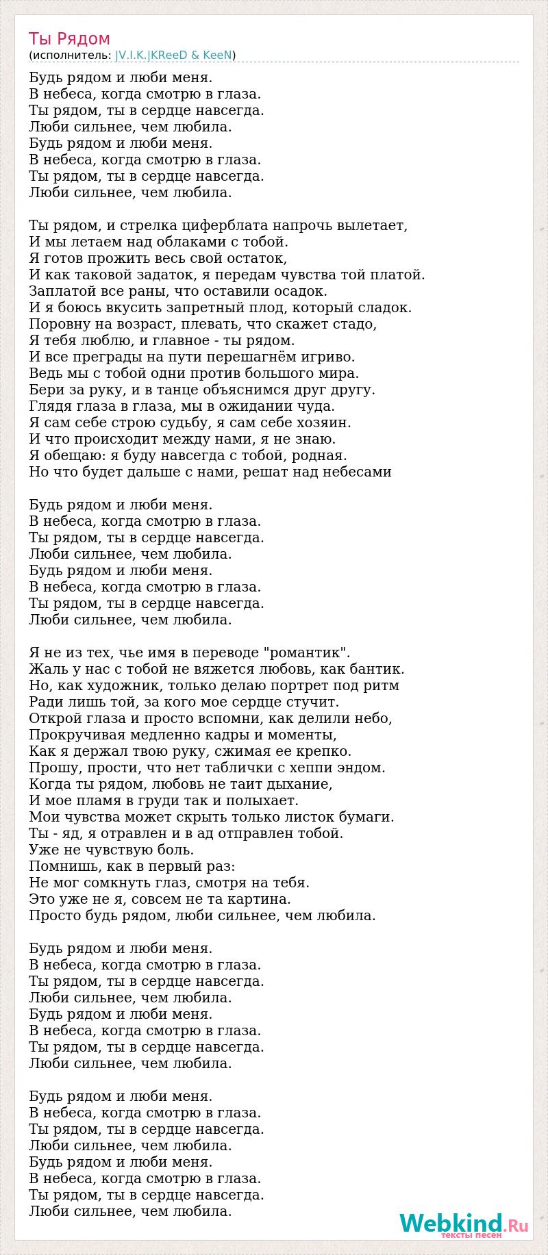 Будь рядом и люби меня. В небеса, когда смотрю в глаза. Ты рядом, ты в сердце навсегда. Люби сильнее, чем любила. Будь рядом и люби меня. В небеса, когда смотрю в глаза. Ты рядом, ты в сердце навсегда. Люби сильнее, чем любила. Ты рядом, и стрелка циферблата напрочь вылетает, И мы летаем над облаками с тобой. Я готов прожить весь свой остаток, И как таковой задаток, я передам чувства той платой. Заплатой все раны, что оставили осадок. И я боюсь вкусить запретный плод, который сладок. Поровну на возраст, плевать, что скажет стадо, Я тебя люблю, и главное - ты рядом. И все преграды на пути перешагнём игриво. Ведь мы с тобой одни против большого мира. Бери за руку, и в танце объяснимся друг другу. Глядя глаза в глаза, мы в ожидании чуда. Я сам себе строю судьбу, я сам себе хозяин. И что происходит между нами, я не знаю. Я обещаю: я буду навсегда с тобой, родная. Но что будет дальше с нами, решат над небесами Будь рядом и люби меня. В небеса, когда смотрю в глаза. Ты рядом, ты в сердце навсегда. Люби сильнее, чем любила. Будь рядом и люби меня. В небеса, когда смотрю в глаза. Ты рядом, ты в сердце навсегда. Люби сильнее, чем любила. Я не из тех, чье имя в переводе "романтик". Жаль у нас с тобой не вяжется любовь, как бантик. Но, как художник, только делаю портрет под ритм Ради лишь той, за кого мое сердце стучит. Открой глаза и просто вспомни, как делили небо, Прокручивая медленно кадры и моменты, Как я держал твою руку, сжимая ее крепко. Прошу, прости, что нет таблички с хеппи эндом. Когда ты рядом, любовь не таит дыхание, И мое пламя в груди так и полыхает. Мои чувства может скрыть только листок бумаги. Ты - яд, я отравлен и в ад отправлен тобой. Уже не чувствую боль. Помнишь, как в первый раз: Не мог сомкнуть глаз, смотря на тебя. Это уже не я, совсем не та картина. Просто будь рядом, люби сильнее, чем любила. Будь рядом и люби меня. В небеса, когда смотрю в глаза. Ты рядом, ты в сердце навсегда. Люби сильнее, чем любила. Будь рядом и люби меня. В небеса, когда смотрю в глаза. Ты рядом, ты в сердце навсегда. Люби сильнее, чем любила. Будь рядом и люби меня. В небеса, когда смотрю в глаза. Ты рядом, ты в сердце навсегда. Люби сильнее, чем любила. Будь рядом и люби меня. В небеса, когда смотрю в глаза. Ты рядом, ты в сердце навсегда. Люби сильнее, чем любила.
