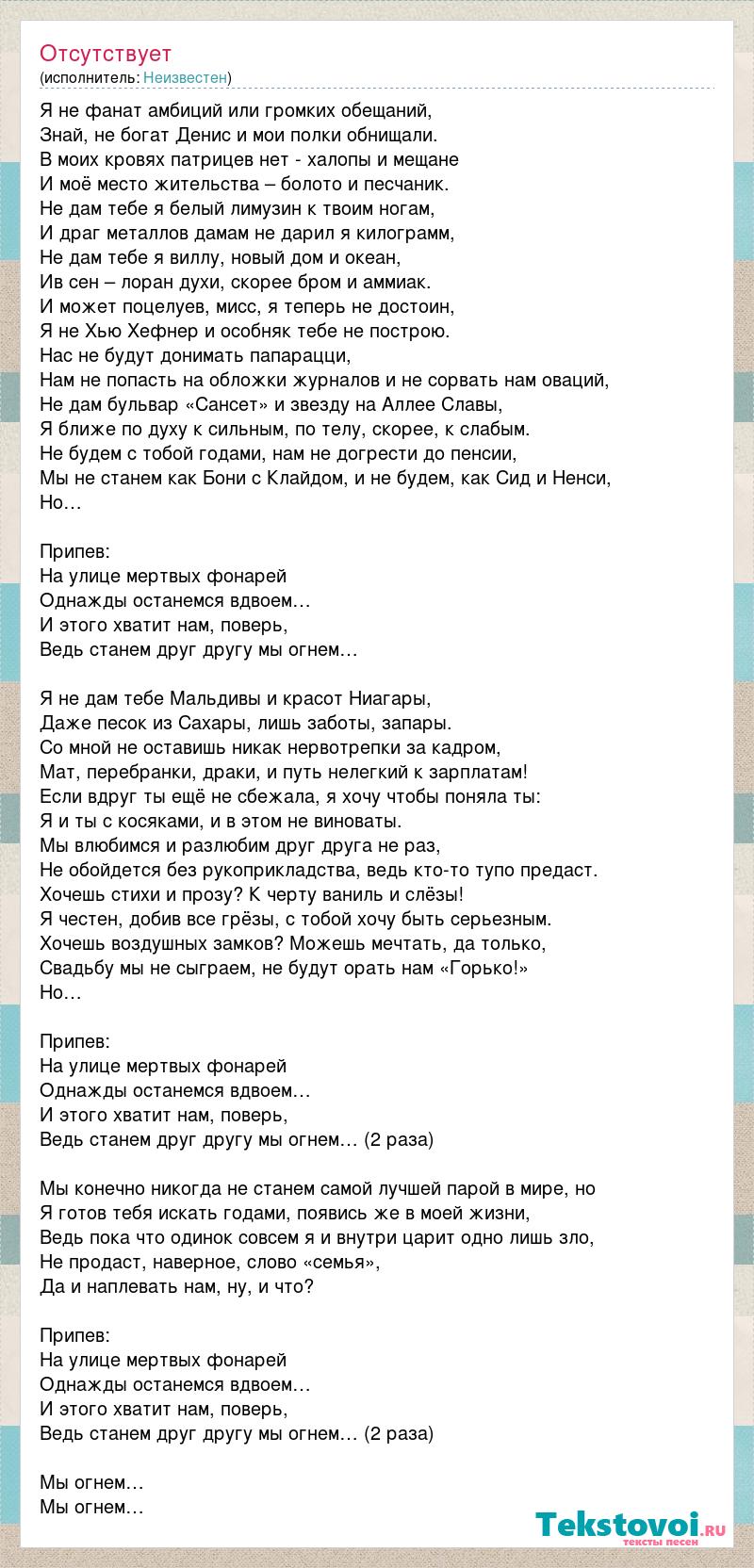 Я не фанат амбиций или громких обещаний, Знай, не богат Денис и мои полки обнищали. В моих кровях патрицев нет - халопы и мещане И моё место жительства – болото и песчаник. Не дам тебе я белый лимузин к твоим ногам, И драг металлов дамам не дарил я килограмм, Не дам тебе я виллу, новый дом и океан, Ив сен – лоран духи, скорее бром и аммиак. И может поцелуев, мисс, я теперь не достоин, Я не Хью Хефнер и особняк тебе не построю. Нас не будут донимать папарацци, Нам не попасть на обложки журналов и не сорвать нам оваций, Не дам бульвар «Сансет» и звезду на Аллее Славы, Я ближе по духу к сильным, по телу, скорее, к слабым. Не будем с тобой годами, нам не догрести до пенсии, Мы не станем как Бони с Клайдом, и не будем, как Сид и Ненси, Но… Припев: На улице мертвых фонарей Однажды останемся вдвоем… И этого хватит нам, поверь, Ведь станем друг другу мы огнем… Я не дам тебе Мальдивы и красот Ниагары, Даже песок из Сахары, лишь заботы, запары. Со мной не оставишь никак нервотрепки за кадром, Мат, перебранки, драки, и путь нелегкий к зарплатам! Если вдруг ты ещё не сбежала, я хочу чтобы поняла ты: Я и ты с косяками, и в этом не виноваты. Мы влюбимся и разлюбим друг друга не раз, Не обойдется без рукоприкладства, ведь кто-то тупо предаст. Хочешь стихи и прозу? К черту ваниль и слёзы! Я честен, добив все грёзы, с тобой хочу быть серьезным. Хочешь воздушных замков? Можешь мечтать, да только, Свадьбу мы не сыграем, не будут орать нам «Горько!» Но… Припев: На улице мертвых фонарей Однажды останемся вдвоем… И этого хватит нам, поверь, Ведь станем друг другу мы огнем… (2 раза) Мы конечно никогда не станем самой лучшей парой в мире, но Я готов тебя искать годами, появись же в моей жизни, Ведь пока что одинок совсем я и внутри царит одно лишь зло, Не продаст, наверное, слово «семья», Да и наплевать нам, ну, и что? Припев: На улице мертвых фонарей Однажды останемся вдвоем… И этого хватит нам, поверь, Ведь станем друг другу мы огнем… (2 раза) Мы огнем… Мы огнем…