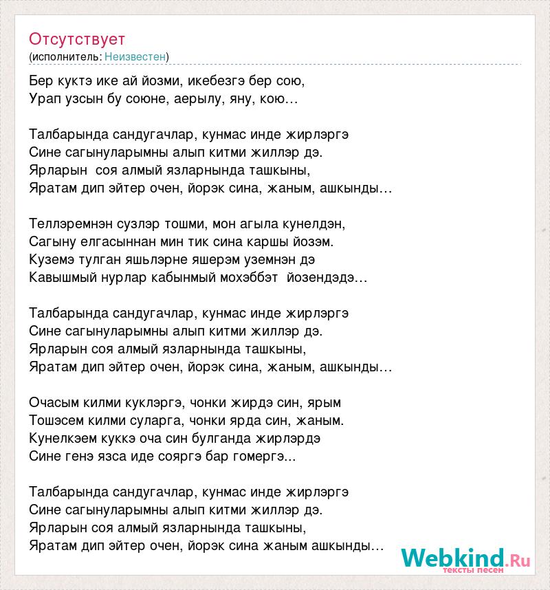 Бер куктэ ике ай йозми, икебезгэ бер сою, Урап узсын бу союне, аерылу, яну, кою… Талбарында сандугачлар, кунмас инде жирлэргэ Сине сагынуларымны алып китми жиллэр дэ. Ярларын соя алмый язларнында ташкыны, Яратам дип эйтер очен, йорэк сина, жаным, ашкынды… Теллэремнэн сузлэр тошми, мон агыла кунелдэн, Сагыну елгасыннан мин тик сина каршы йозэм. Куземэ тулган яшьлэрне яшерэм уземнэн дэ Кавышмый нурлар кабынмый мохэббэт йозендэдэ… Талбарында сандугачлар, кунмас инде жирлэргэ Сине сагынуларымны алып китми жиллэр дэ. Ярларын соя алмый язларнында ташкыны, Яратам дип эйтер очен, йорэк сина, жаным, ашкынды… Очасым килми куклэргэ, чонки жирдэ син, ярым Тошэсем килми суларга, чонки ярда син, жаным. Кунелкэем куккэ оча син булганда жирлэрдэ Сине генэ язса иде сояргэ бар гомергэ... Талбарында сандугачлар, кунмас инде жирлэргэ Сине сагынуларымны алып китми жиллэр дэ. Ярларын соя алмый язларнында ташкыны, Яратам дип эйтер очен, йорэк сина жаным ашкынды…