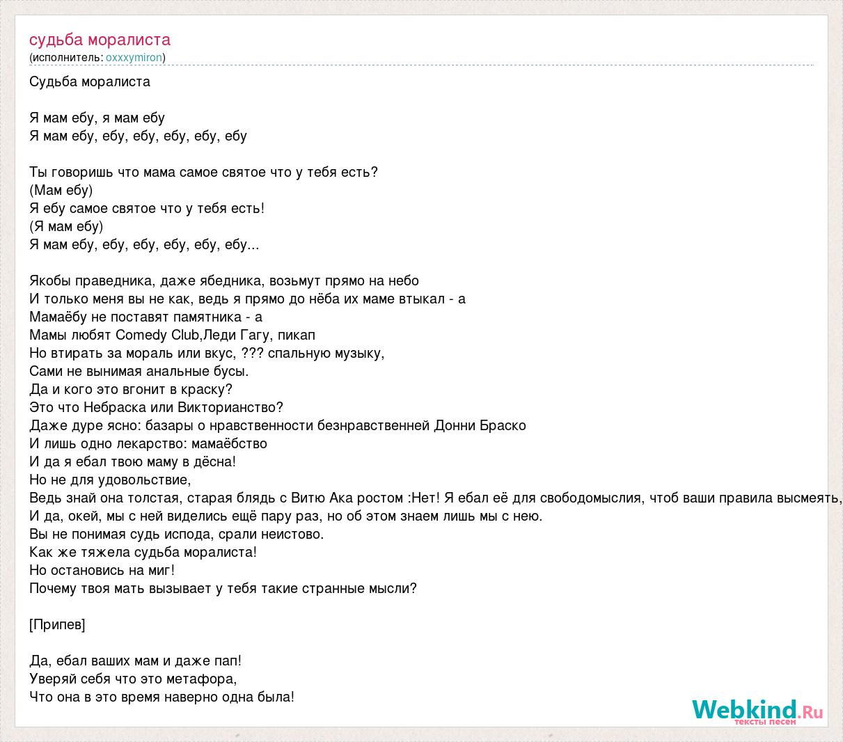Судьба моралиста Я мам ебу, я мам ебу Я мам ебу, ебу, ебу, ебу, ебу, ебу Ты говоришь что мама самое святое что у тебя есть? (Мам ебу) Я ебу самое святое что у тебя есть! (Я мам ебу) Я мам ебу, ебу, ебу, ебу, ебу, ебу... Якобы праведника, даже ябедника, возьмут прямо на небо И только меня вы не как, ведь я прямо до нёба их маме втыкал - а Мамаёбу не поставят памятника - а Мамы любят Comedy Club,Леди Гагу, пикап Но втирать за мораль или вкус, ??? спальную музыку, Сами не вынимая анальные бусы. Да и кого это вгонит в краску? Это что Небраска или Викторианство? Даже дуре ясно: базары о нравственности безнравственней Донни Браско И лишь одно лекарство: мамаёбство И да я ебал твою маму в дёсна! Но не для удовольствие, Ведь знай она толстая, старая блядь с Витю Ака ростом :Нет! Я ебал её для свободомыслия, чтоб ваши правила высмеять, И да, окей, мы с ней виделись ещё пару раз, но об этом знаем лишь мы с нею. Вы не понимая судь испода, срали неистово. Как же тяжела судьба моралиста! Но остановись на миг! Почему твоя мать вызывает у тебя такие странные мысли? [Припев] Да, ебал ваших мам и даже пап! Уверяй себя что это метафора, Что она в это время наверно одна была!
