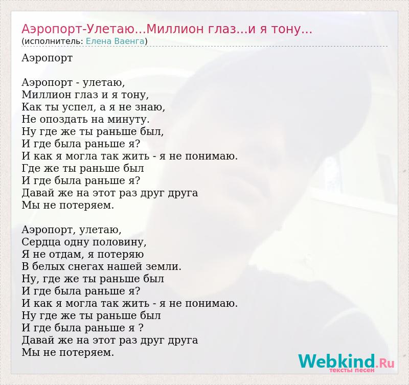 Аэропорт Аэропорт - улетаю, Миллион глаз и я тону, Как ты успел, а я не знаю, Не опоздать на минуту. Ну где же ты раньше был, И где была раньше я? И как я могла так жить - я не понимаю. Где же ты раньше был И где была раньше я? Давай же на этот раз друг друга Мы не потеряем. Аэропорт, улетаю, Сердца одну половину, Я не отдам, я потеряю В белых снегах нашей земли. Ну, где же ты раньше был И где была раньше я? И как я могла так жить - я не понимаю. Ну где же ты раньше был И где была раньше я ? Давай же на этот раз друг друга Мы не потеряем.