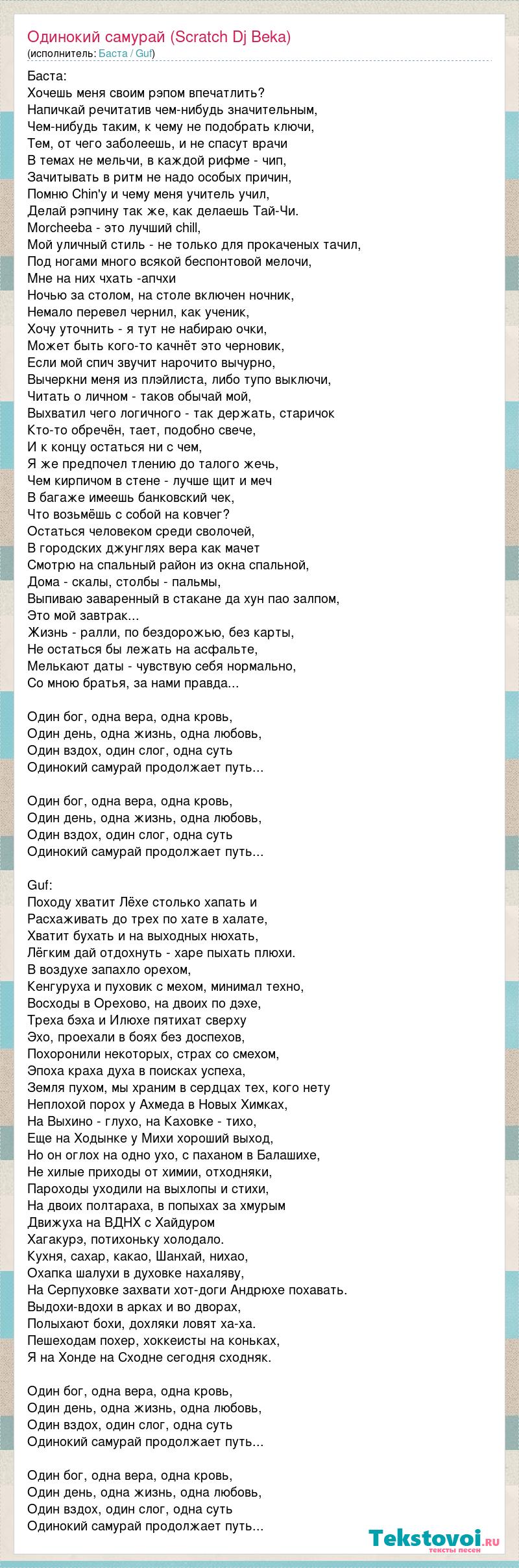 Баста: Хочешь меня своим рэпом впечатлить? Напичкай речитатив чем-нибудь значительным, Чем-нибудь таким, к чему не подобрать ключи, Тем, от чего заболеешь, и не спасут врачи В темах не мельчи, в каждой рифме - чип, Зачитывать в ритм не надо особых причин, Помню Chin'у и чему меня учитель учил, Делай рэпчину так же, как делаешь Тай-Чи. Morcheeba - это лучший chill, Мой уличный стиль - не только для прокаченых тачил, Под ногами много всякой беспонтовой мелочи, Мне на них чхать -апчхи Ночью за столом, на столе включен ночник, Немало перевел чернил, как ученик, Хочу уточнить - я тут не набираю очки, Может быть кого-то качнёт это черновик, Если мой спич звучит нарочито вычурно, Вычеркни меня из плэйлиста, либо тупо выключи, Читать о личном - таков обычай мой, Выхватил чего логичного - так держать, старичок Кто-то обречён, тает, подобно свече, И к концу остаться ни с чем, Я же предпочел тлению до талого жечь, Чем кирпичом в стене - лучше щит и меч В багаже имеешь банковский чек, Что возьмёшь с собой на ковчег? Остаться человеком среди сволочей, В городских джунглях вера как мачет Смотрю на спальный район из окна спальной, Дома - скалы, столбы - пальмы, Выпиваю заваренный в стакане да хун пао залпом, Это мой завтрак... Жизнь - ралли, по бездорожью, без карты, Не остаться бы лежать на асфальте, Мелькают даты - чувствую себя нормально, Со мною братья, за нами правда... Один бог, одна вера, одна кровь, Один день, одна жизнь, одна любовь, Один вздох, один слог, одна суть Одинокий самурай продолжает путь... Один бог, одна вера, одна кровь, Один день, одна жизнь, одна любовь, Один вздох, один слог, одна суть Одинокий самурай продолжает путь... Guf: Походу хватит Лёхе столько хапать и Расхаживать до трех по хате в халате, Хватит бухать и на выходных нюхать, Лёгким дай отдохнуть - харе пыхать плюхи. В воздухе запахло орехом, Кенгуруха и пуховик с мехом, минимал техно, Восходы в Орехово, на двоих по дэхе, Треха бэха и Илюхе пятихат сверху Эхо, проехали в боях без доспехов, Похоронили некоторых, страх со смехом, Эпоха краха духа в поисках успеха, Земля пухом, мы храним в сердцах тех, кого нету Неплохой порох у Ахмеда в Новых Химках, На Выхино - глухо, на Каховке - тихо, Еще на Ходынке у Михи хороший выход, Но он оглох на одно ухо, с паханом в Балашихе, Не хилые приходы от химии, отходняки, Пароходы уходили на выхлопы и стихи, На двоих полтараха, в попыхах за хмурым Движуха на ВДНХ с Хайдуром Хагакурэ, потихоньку холодало. Кухня, сахар, какао, Шанхай, нихао, Охапка шалухи в духовке нахаляву, На Серпуховке захвати хот-доги Андрюхе похавать. Выдохи-вдохи в арках и во дворах, Полыхают бохи, дохляки ловят ха-ха. Пешеходам похер, хоккеисты на коньках, Я на Хонде на Сходне сегодня сходняк. Один бог, одна вера, одна кровь, Один день, одна жизнь, одна любовь, Один вздох, один слог, одна суть Одинокий самурай продолжает путь... Один бог, одна вера, одна кровь, Один день, одна жизнь, одна любовь, Один вздох, один слог, одна суть Одинокий самурай продолжает путь...
