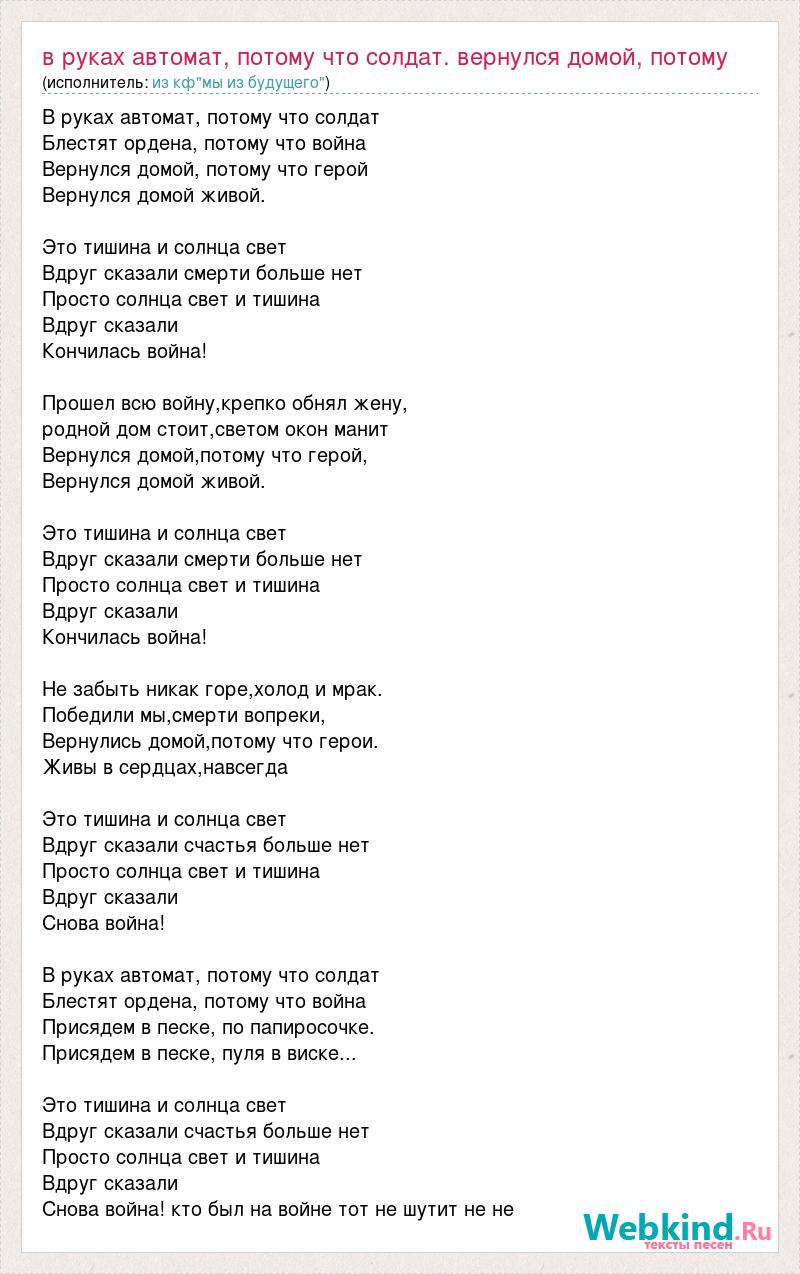 В руках автомат, потому что солдат Блестят ордена, потому что война Вернулся домой, потому что герой Вернулся домой живой. Это тишина и солнца свет Вдруг сказали смерти больше нет Просто солнца свет и тишина Вдруг сказали Кончилась война! Прошел всю войну,крепко обнял жену, родной дом стоит,светом окон манит Вернулся домой,потому что герой, Вернулся домой живой. Это тишина и солнца свет Вдруг сказали смерти больше нет Просто солнца свет и тишина Вдруг сказали Кончилась война! Не забыть никак горе,холод и мрак. Победили мы,смерти вопреки, Вернулись домой,потому что герои. Живы в сердцах,навсегда Это тишина и солнца свет Вдруг сказали счастья больше нет Просто солнца свет и тишина Вдруг сказали Снова война! В руках автомат, потому что солдат Блестят ордена, потому что война Присядем в песке, по папиросочке. Присядем в песке, пуля в виске... Это тишина и солнца свет Вдруг сказали счастья больше нет Просто солнца свет и тишина Вдруг сказали Снова война! кто был на войне тот не шутит не не