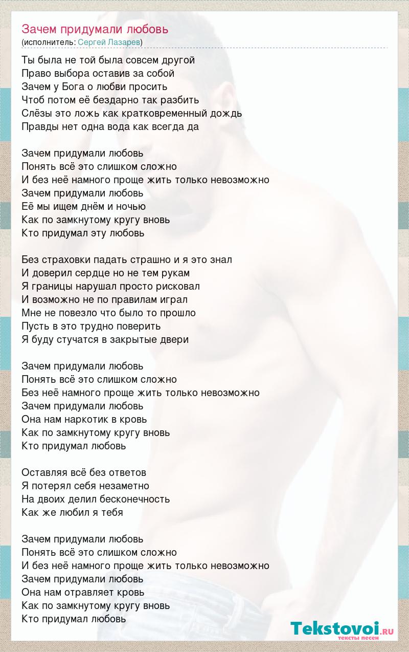 Ты была не той была совсем другой Право выбора оставив за собой Зачем у Бога о любви просить Чтоб потом её бездарно так разбить Слёзы это ложь как кратковременный дождь Правды нет одна вода как всегда да Зачем придумали любовь Понять всё это слишком сложно И без неё намного проще жить только невозможно Зачем придумали любовь Её мы ищем днём и ночью Как по замкнутому кругу вновь Кто придумал эту любовь Без страховки падать страшно и я это знал И доверил сердце но не тем рукам Я границы нарушал просто рисковал И возможно не по правилам играл Мне не повезло что было то прошло Пусть в это трудно поверить Я буду стучатся в закрытые двери Зачем придумали любовь Понять всё это слишком сложно Без неё намного проще жить только невозможно Зачем придумали любовь Она нам наркотик в кровь Как по замкнутому кругу вновь Кто придумал любовь Оставляя всё без ответов Я потерял себя незаметно На двоих делил бесконечность Как же любил я тебя Зачем придумали любовь Понять всё это слишком сложно И без неё намного проще жить только невозможно Зачем придумали любовь Она нам отравляет кровь Как по замкнутому кругу вновь Кто придумал любовь
