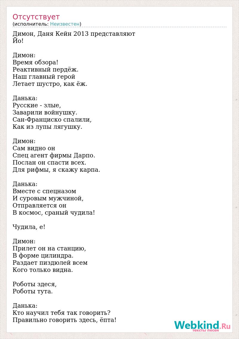 Димон, Даня Кейн 2013 представляют Йо! Димон: Время обзора! Реактивный пердёж. Наш главный герой Летает шустро, как ёж. Данька: Русские - злые, Заварили войнушку. Сан-Франциско спалили, Как из лупы лягушку. Димон: Сам видно он Спец агент фирмы Дарпо. Послан он спасти всех. Для рифмы, я скажу карпа. Данька: Вместе с спецназом И суровым мужчиной, Отправляется он В космос, сраный чудила! Чудила, е! Димон: Прилет он на станцию, В форме цилиндра. Раздает пиздюлей всем Кого только видна. Роботы здеся, Роботы тута. Данька: Кто научил тебя так говорить? Правильно говорить здесь, ёпта!