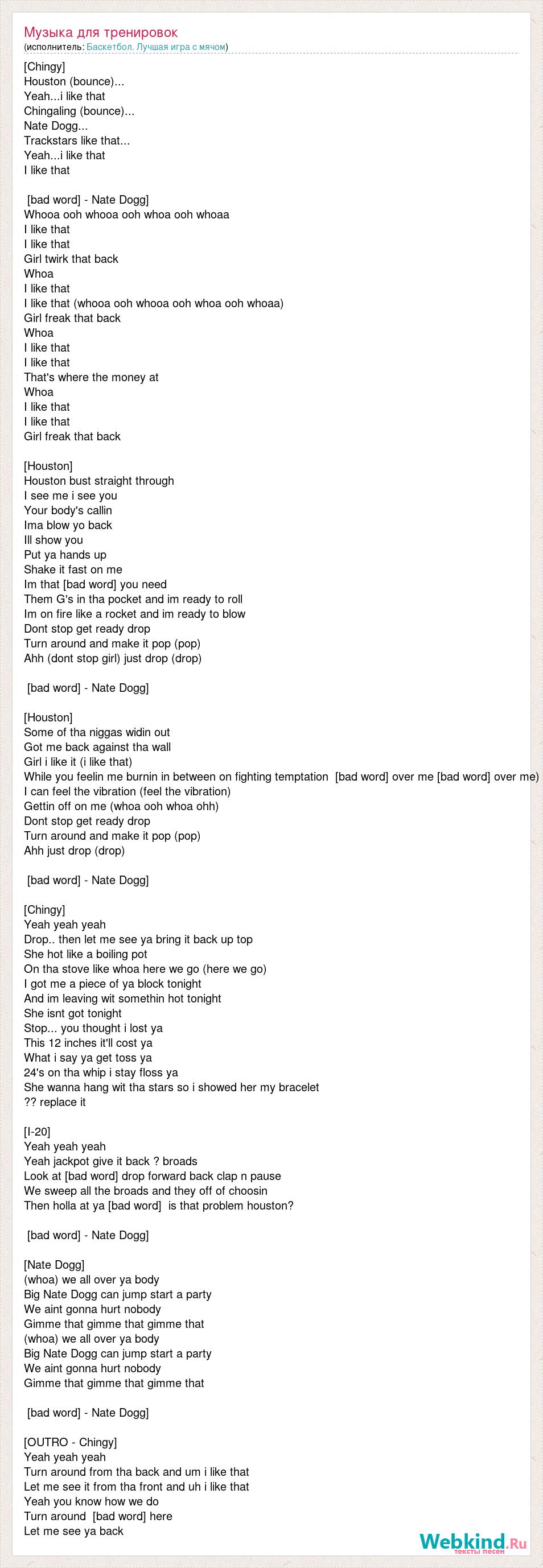 [Chingy] Houston (bounce)... Yeah...i like that Chingaling (bounce)... Nate Dogg... Trackstars like that... Yeah...i like that I like that [bad word] - Nate Dogg] Whooa ooh whooa ooh whoa ooh whoaa I like that I like that Girl twirk that back Whoa I like that I like that (whooa ooh whooa ooh whoa ooh whoaa) Girl freak that back Whoa I like that I like that That's where the money at Whoa I like that I like that Girl freak that back [Houston] Houston bust straight through I see me i see you Your body's callin Ima blow yo back Ill show you Put ya hands up Shake it fast on me Im that [bad word] you need Them G's in tha pocket and im ready to roll Im on fire like a rocket and im ready to blow Dont stop get ready drop Turn around and make it pop (pop) Ahh (dont stop girl) just drop (drop) [bad word] - Nate Dogg] [Houston] Some of tha niggas widin out Got me back against tha wall Girl i like it (i like that) While you feelin me burnin in between on fighting temptation [bad word] over me [bad word] over me) I can feel the vibration (feel the vibration) Gettin off on me (whoa ooh whoa ohh) Dont stop get ready drop Turn around and make it pop (pop) Ahh just drop (drop) [bad word] - Nate Dogg] [Chingy] Yeah yeah yeah Drop.. then let me see ya bring it back up top She hot like a boiling pot On tha stove like whoa here we go (here we go) I got me a piece of ya block tonight And im leaving wit somethin hot tonight She isnt got tonight Stop... you thought i lost ya This 12 inches it'll cost ya What i say ya get toss ya 24's on tha whip i stay floss ya She wanna hang wit tha stars so i showed her my bracelet ?? replace it [I-20] Yeah yeah yeah Yeah jackpot give it back ? broads Look at [bad word] drop forward back clap n pause We sweep all the broads and they off of choosin Then holla at ya [bad word] is that problem houston? [bad word] - Nate Dogg] [Nate Dogg] (whoa) we all over ya body Big Nate Dogg can jump start a party We aint gonna hurt nobody Gimme that gimme that gimme that (whoa) we all over ya body Big Nate Dogg can jump start a party We aint gonna hurt nobody Gimme that gimme that gimme that [bad word] - Nate Dogg] [OUTRO - Chingy] Yeah yeah yeah Turn around from tha back and um i like that Let me see it from tha front and uh i like that Yeah you know how we do Turn around [bad word] here Let me see ya back
